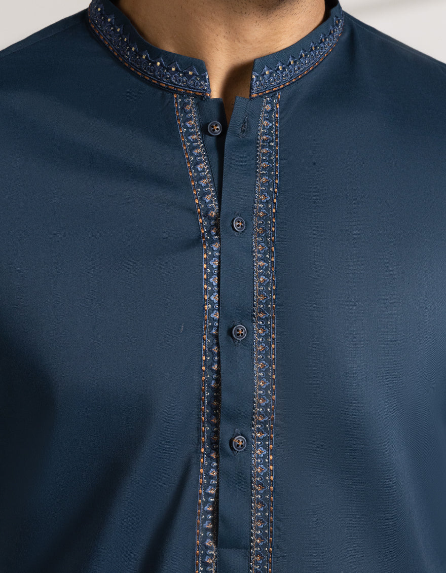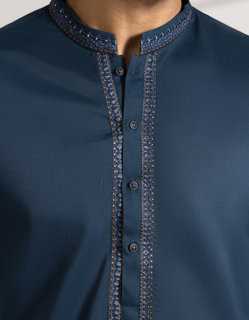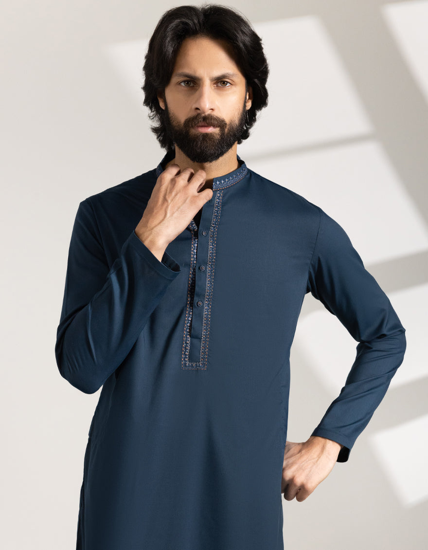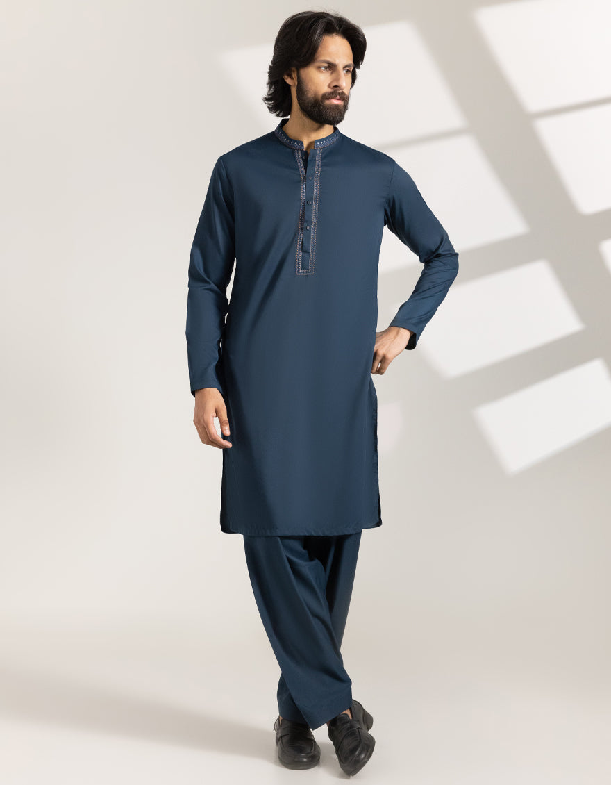 A classic eastern wear set designed with clean stitching and thoughtful detailing. The Teal Blended Formal Kameez Shalwar offers a neat look & comfortable fit - ideal for long wear, daily use, or special occasions with a touch of tradition.