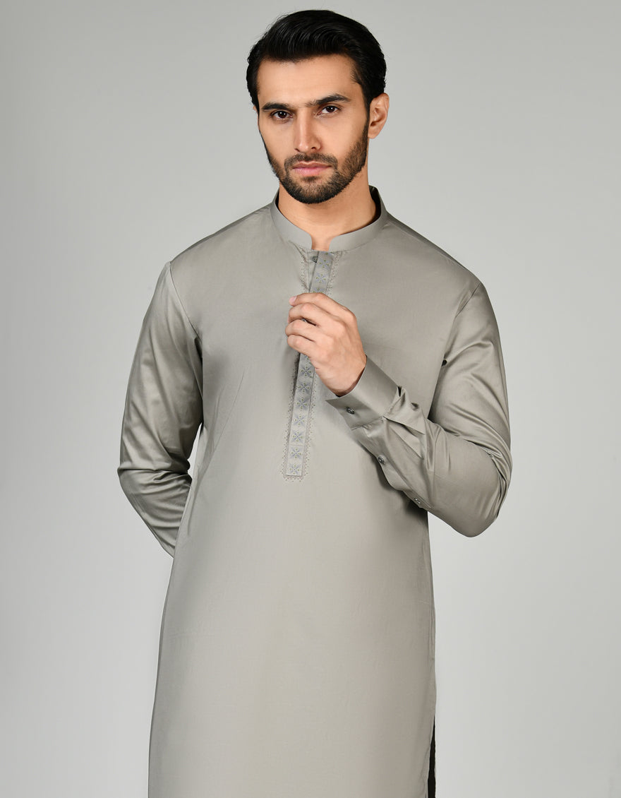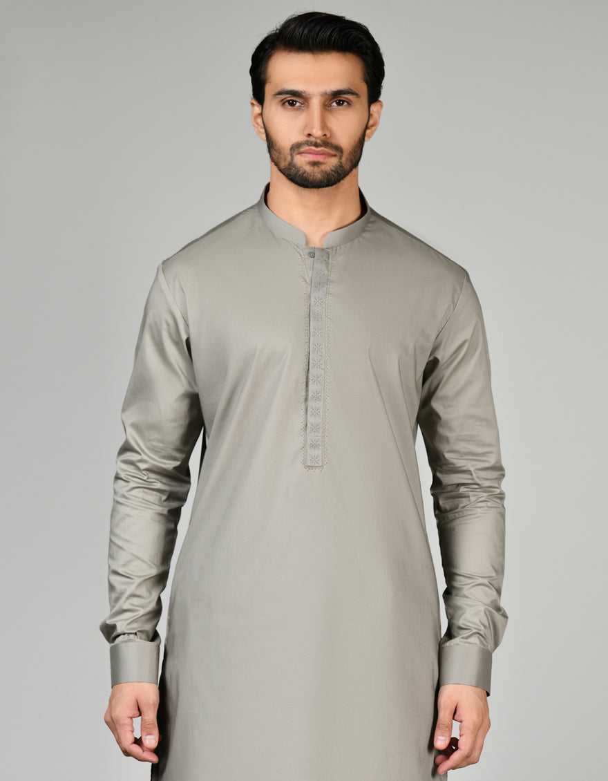 Elevate your semi-formal attire with this Mud Beige Cotton Semi-Formal Kameez Shalwar, blending traditional aesthetics with contemporary style for a sophisticated yet relaxed look
