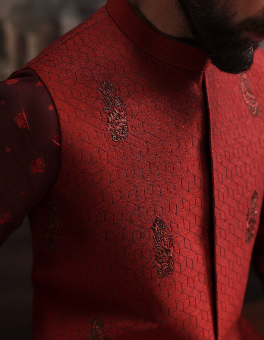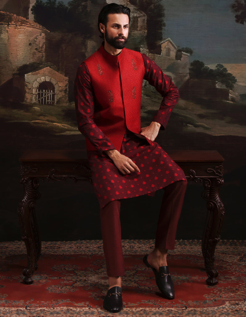 RED POLY-COTTON KURTA TROUSERS & WAISTCOAT | JJKPVC-A-48264/S25/JJ10140-FL