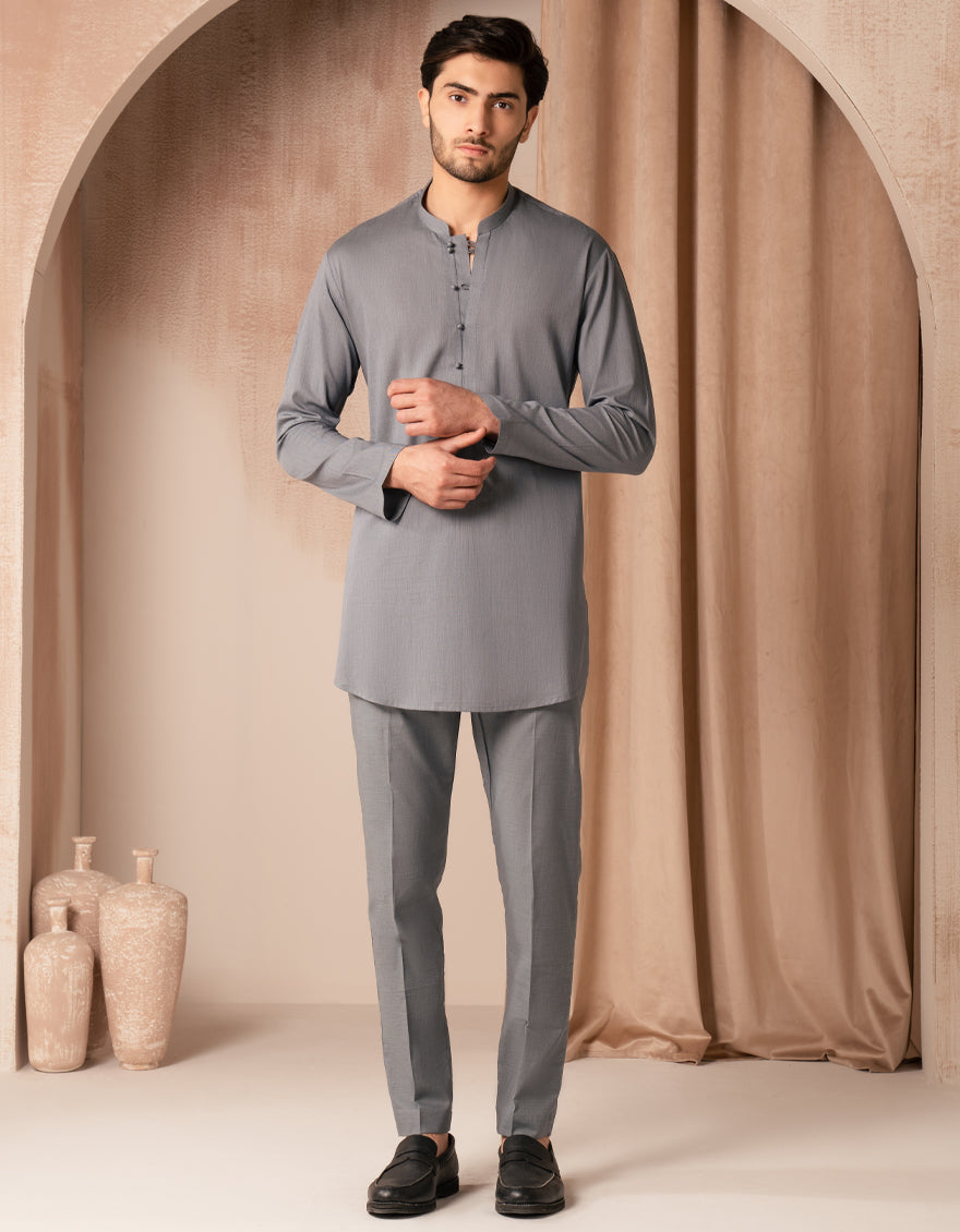 Our new range of Short Kurtas is all about laid-back style and easy comfort. From classic shades to bold colors, each piece is versatile enough to keep your look fresh and effortless. A neat and comfortable grey cotton casual short kurta trouser set designed for everyday wear.