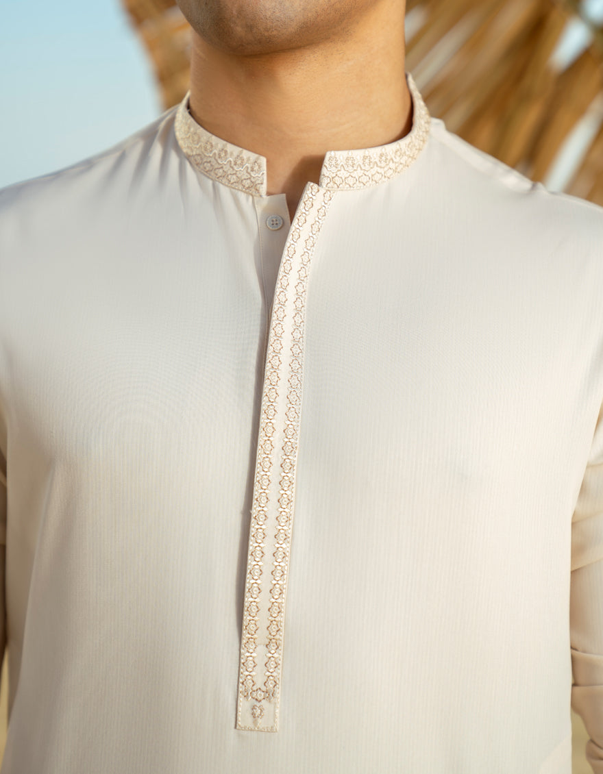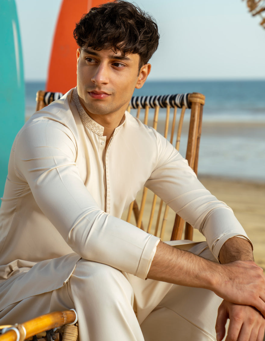 A perfect fusion of tradition and contemporary fashion, this Fawn Blended Kameez Shalwar for teen boys exudes effortless style. Its classic appeal offers versatility, suitable for a wide range of events and environments.