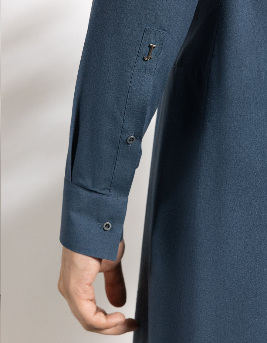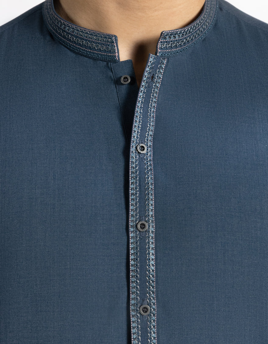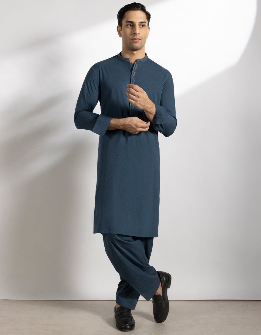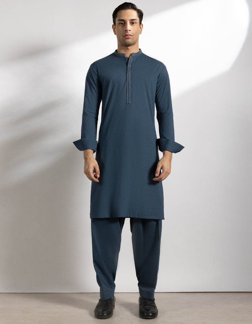 This Denim Blue Blended Kameez Shalwar stands out with its fine stitching and a unique touch of design. Subtle patterns and smart button detailing add to its appeal. A graceful pick that blends decency with a stylish look.