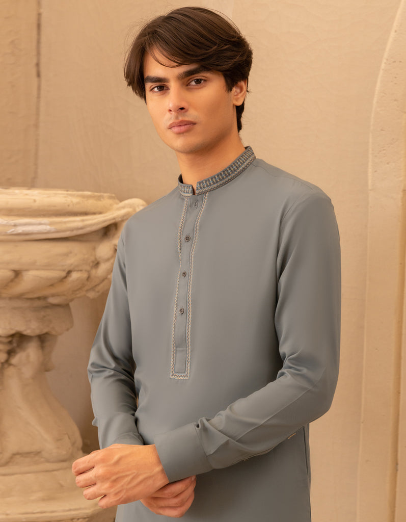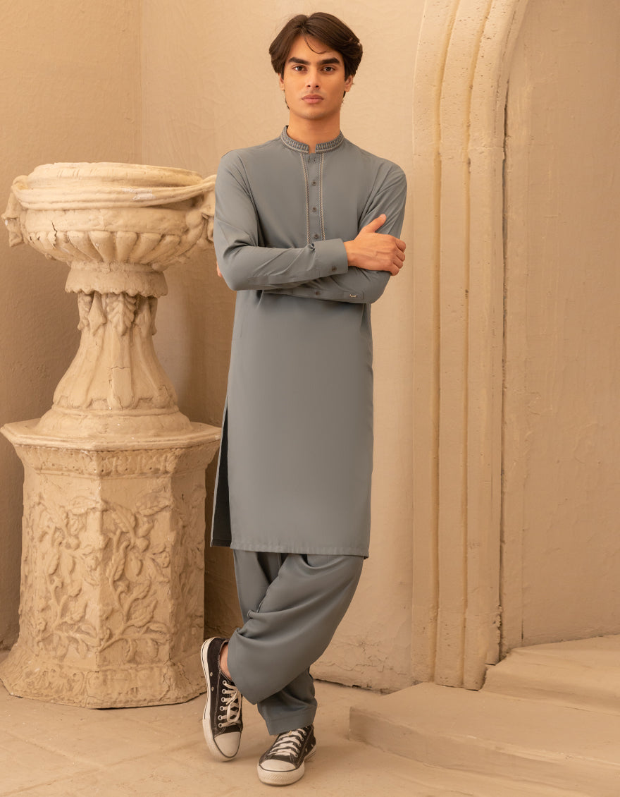 Designed with the young gentleman in mind, this dark cyan blended semi-formal kameez shalwar exudes charm and sophistication. Its classic yet stylish look offers versatility, perfect for both casual and formal occasions.