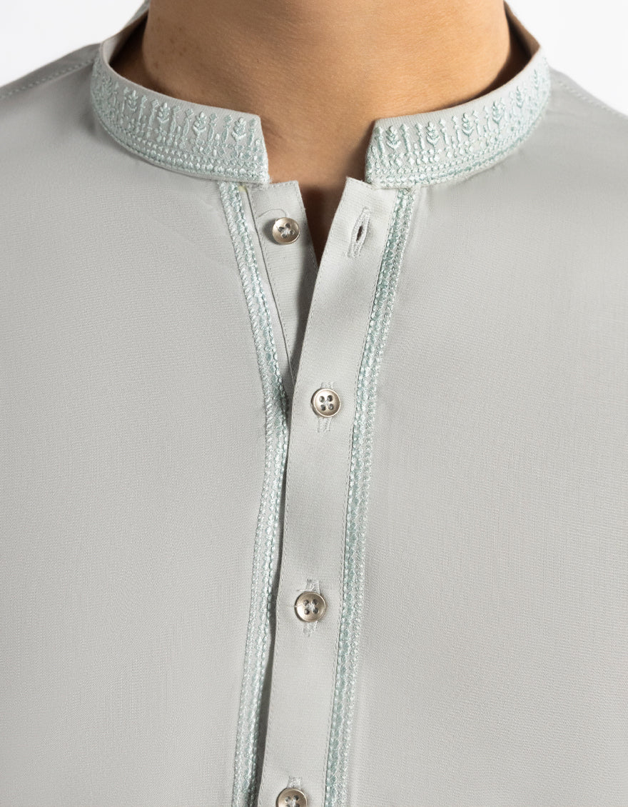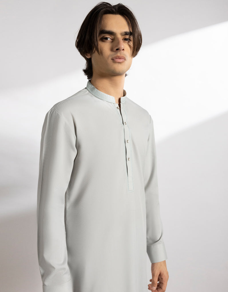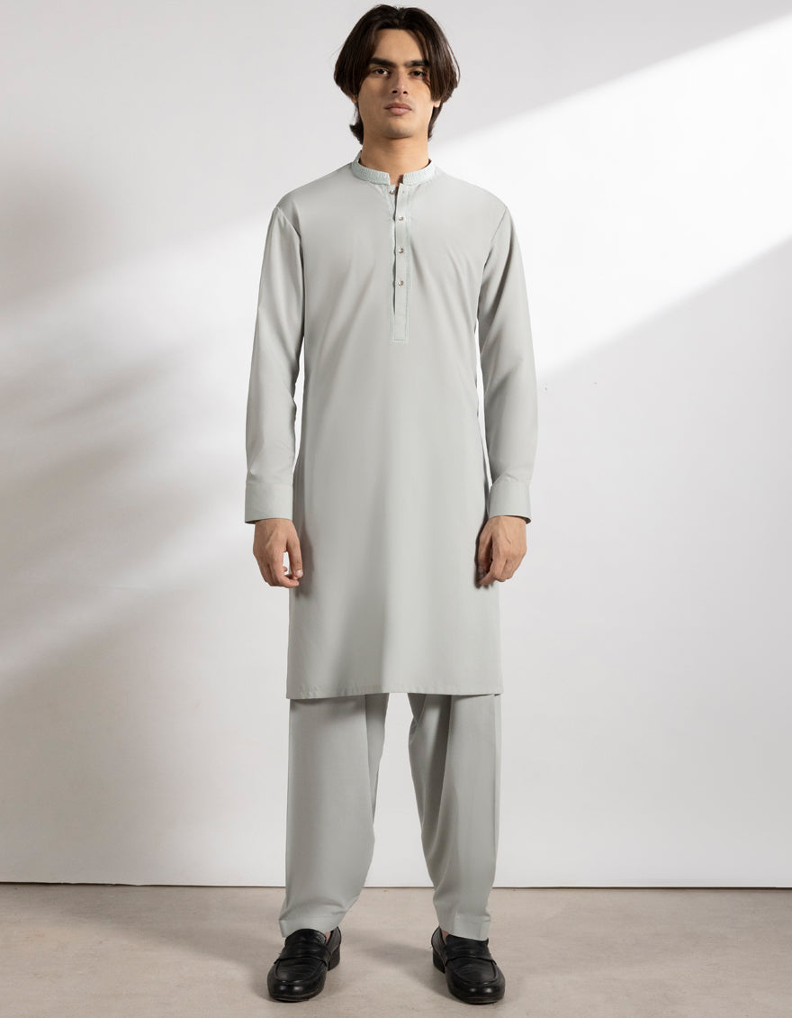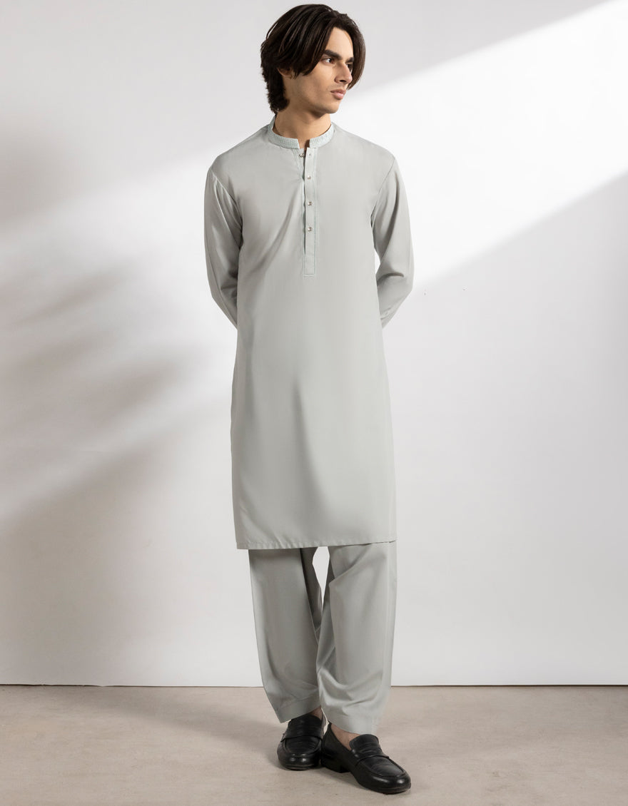 This Ash Grey Blended Kameez Shalwar stands out with its fine stitching and a unique touch of design. Subtle patterns and smart button detailing add to its appeal. A graceful pick that blends decency with a stylish look.