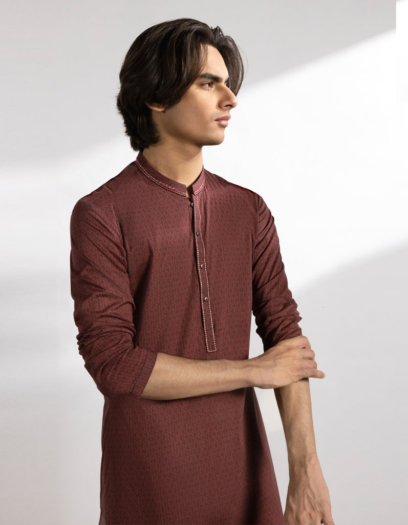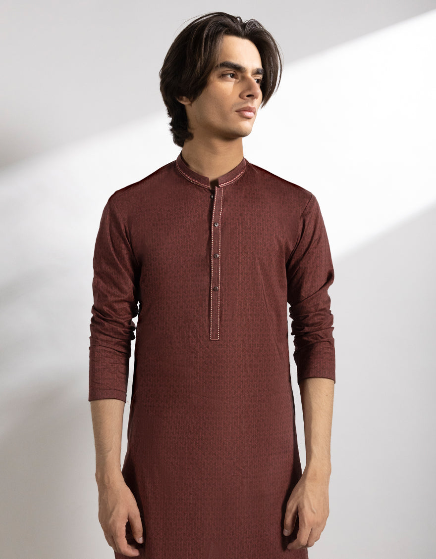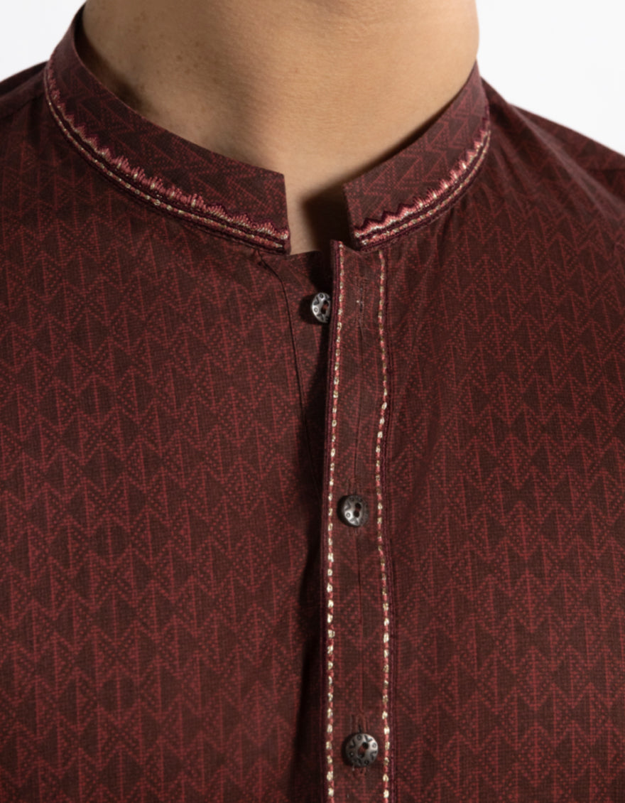 Designed with the young gentleman in mind, this maroon cotton semi-formal kurta exudes charm and sophistication. Its classic yet stylish look offers versatility, perfect for both casual and formal occasions.