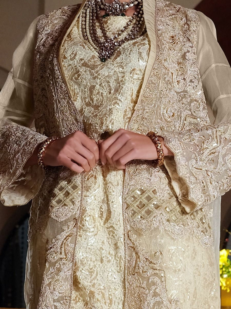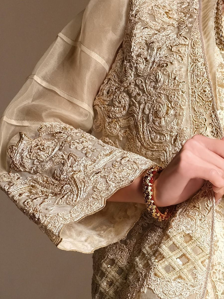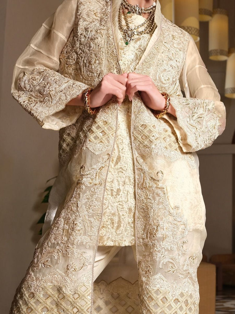 Lime Yellow Embroidered Organza Front Open Coat With Ruffles Details On Neckline, Charmed With Beautiful Textured Inner Shirt. Paired With Cigarette Pants With Pleated Organza Detail.