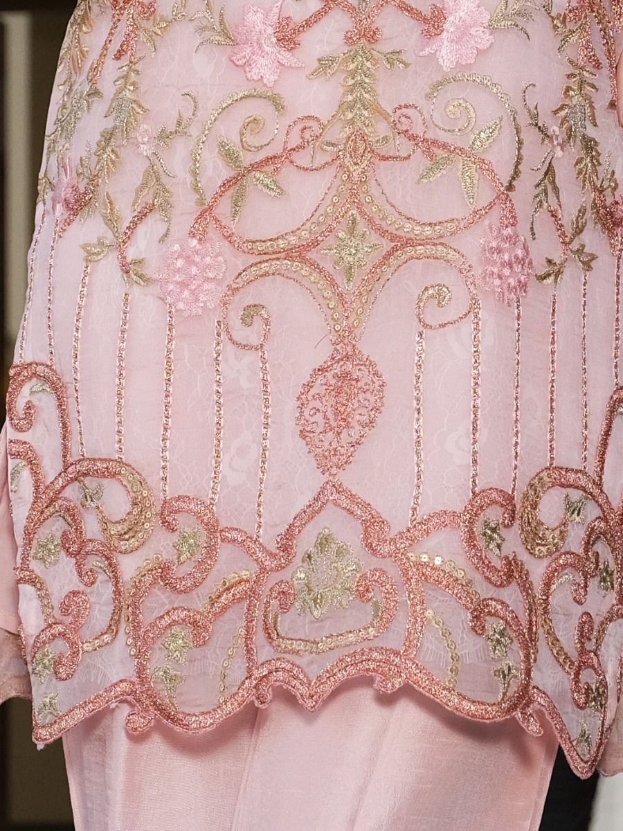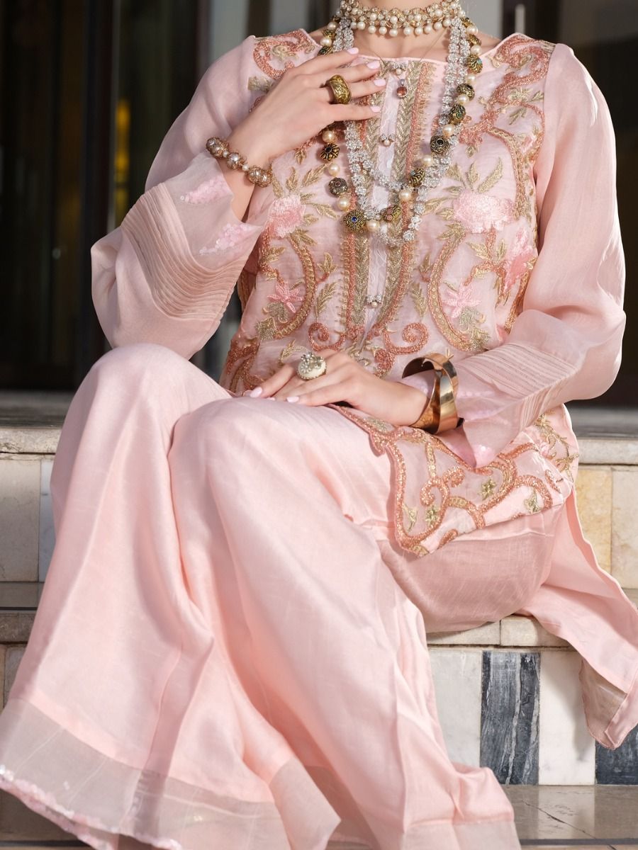 Baby Pink Front Embroidered Short Shirt In Organza With Crystal Button On Neckline And Cut Work Hemline. Paired With Pleated Bell Bottom Pants.