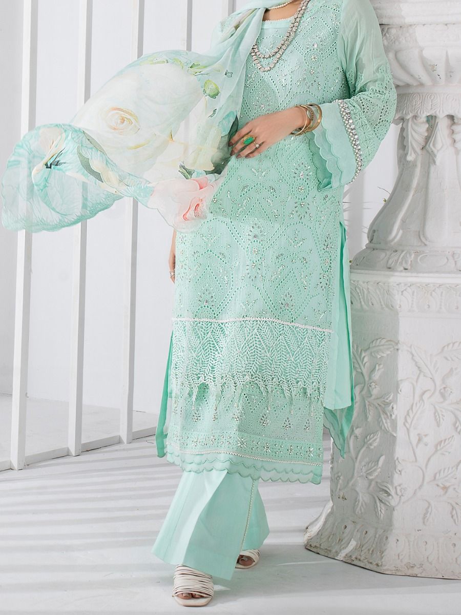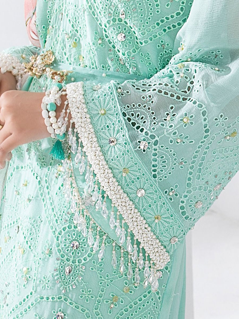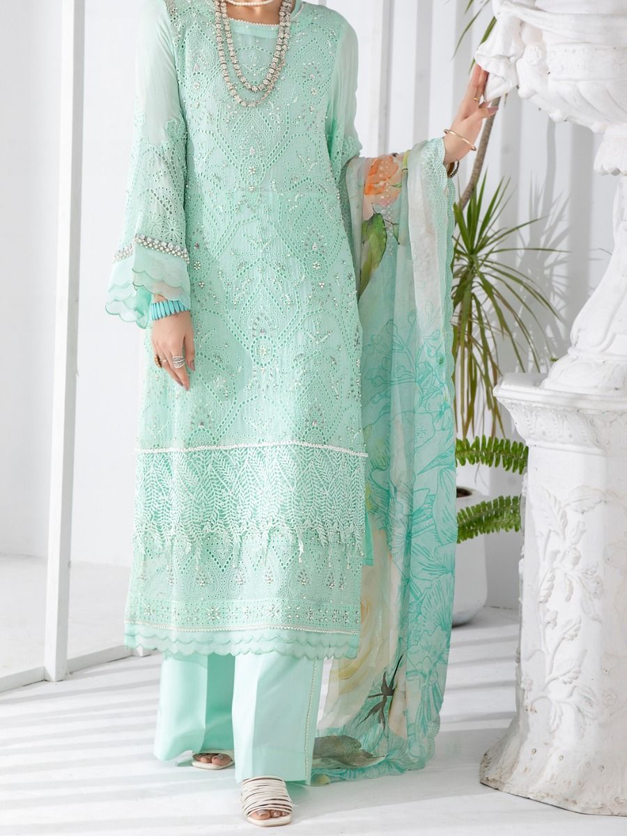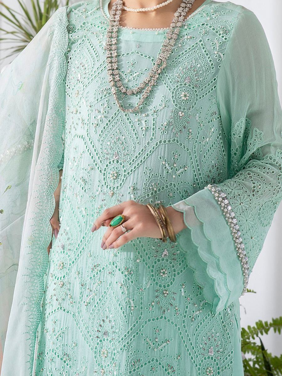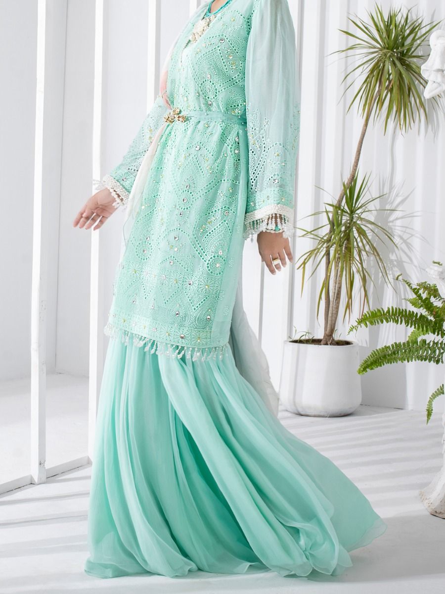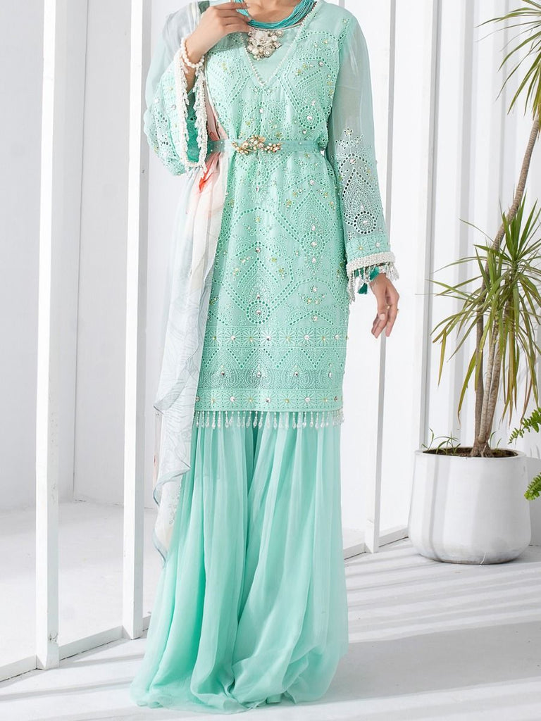 Long Length Chiffon Shirt With Fully Schiffli Embroidery And Embellishes Adding Value With Fancy Fabric, Lace And Organza Details On It Paired With Bell Bottom Pants And Embroidered Digital Printed Chiffon Dupatta.