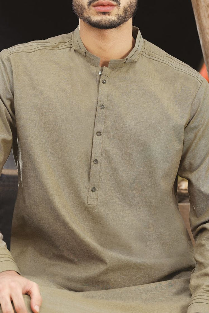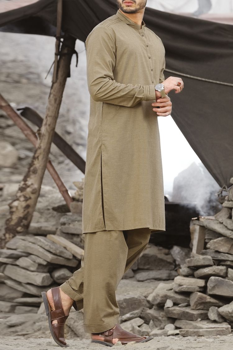 Cut And Sew Kameez Shalwar Stitched In Blended Fabric With Details On Collar, Placket And Cuffs.