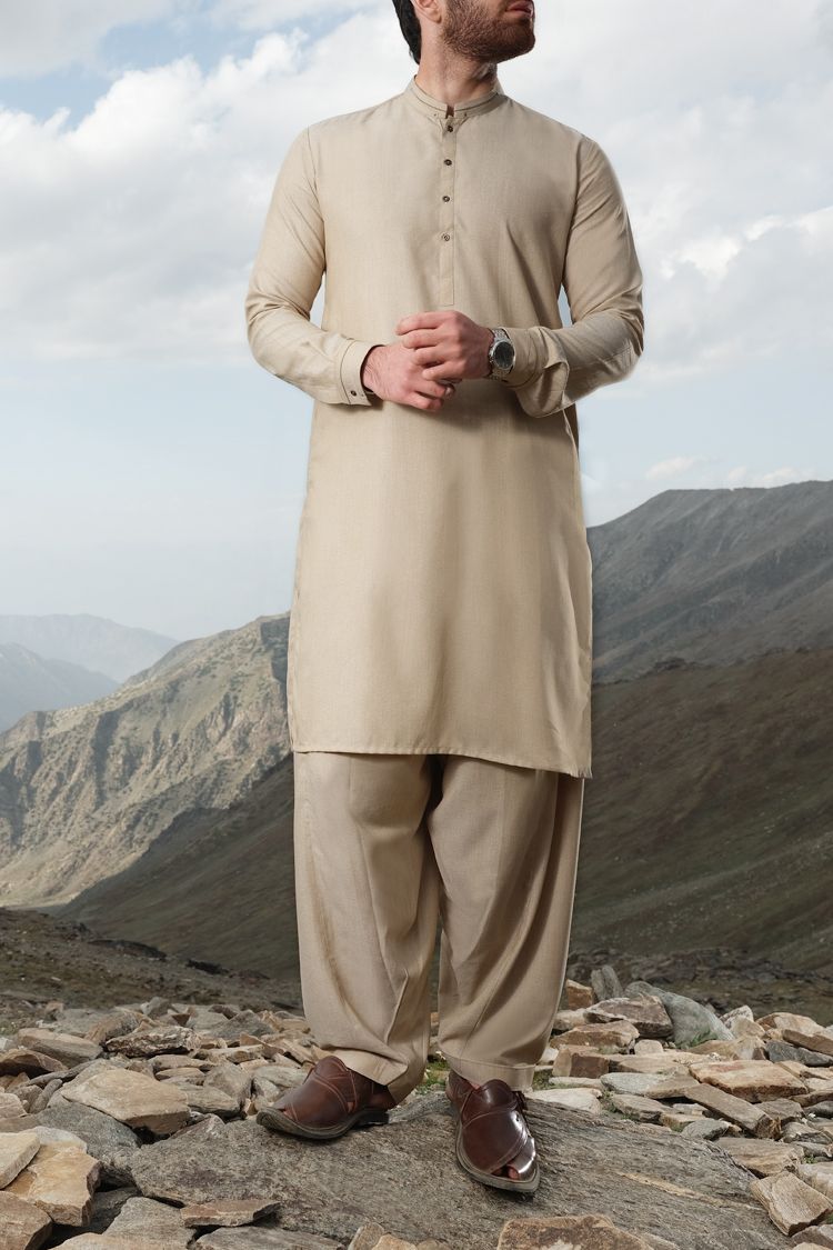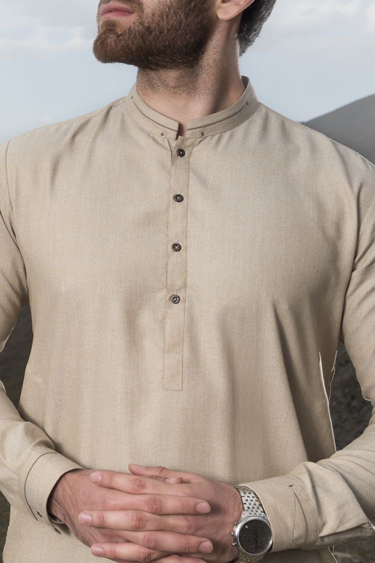 Cut And Sew Kameez Shalwar Stitched In Blended Fabric With Details On Collar, Placket And Cuffs.