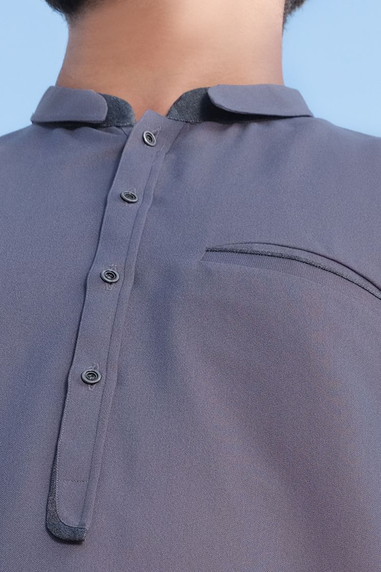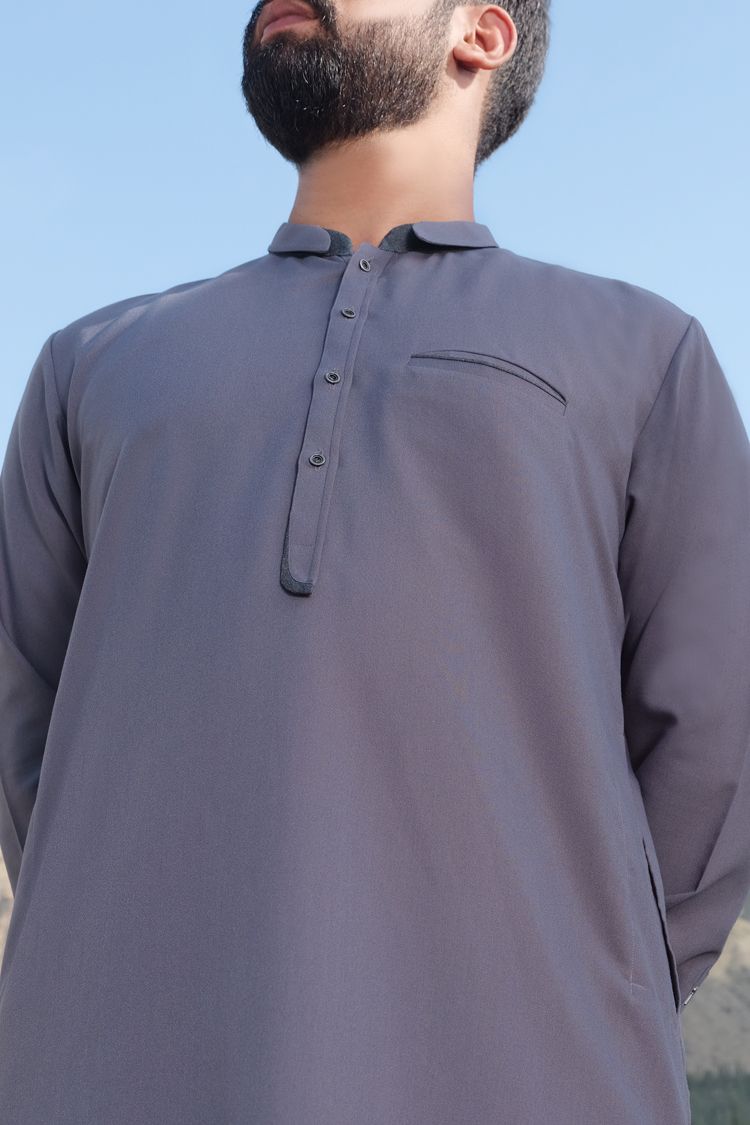 Cut And Sew Kameez Shalwar Stitched In Blended Fabric With Details On Collar, Placket And Cuffs.