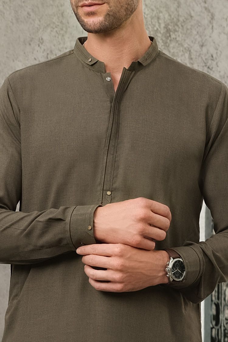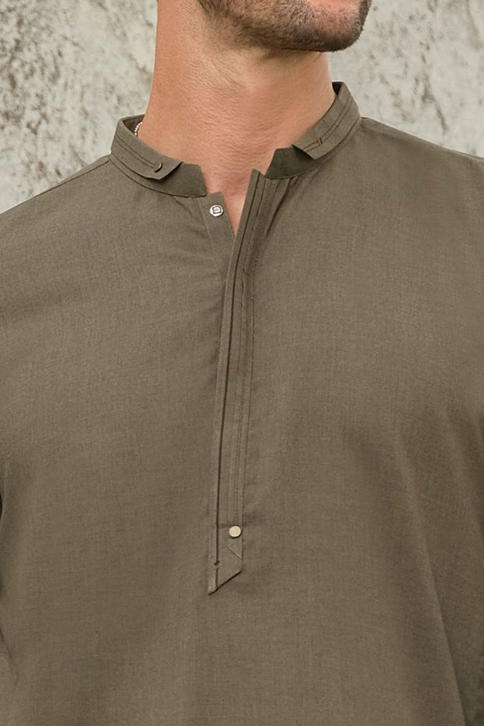 Cut And Sew Kameez Shalwar Stitched In Blended Fabric With Details On Collar, Placket And Cuffs.