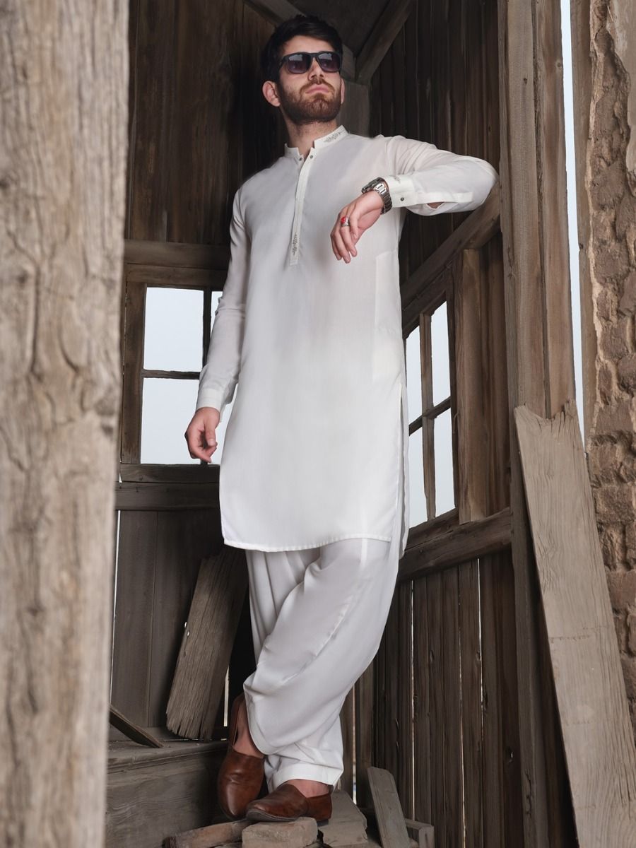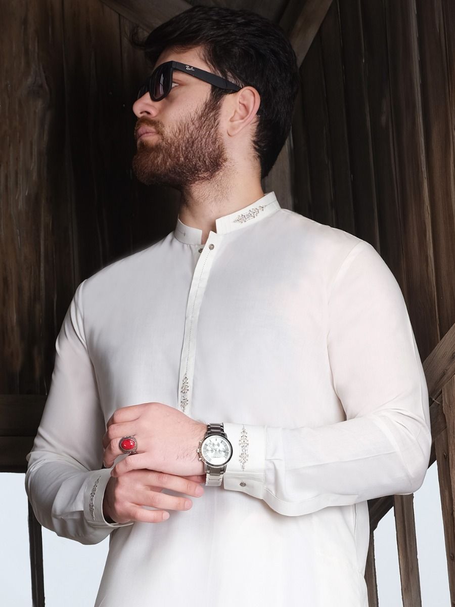 Semi-Formal Kameez Shalwar Stitched In Blended Fabric With Details On Collar, Placket And Cuffs.