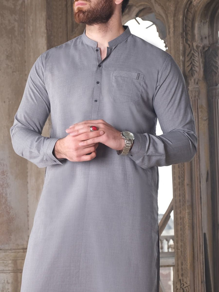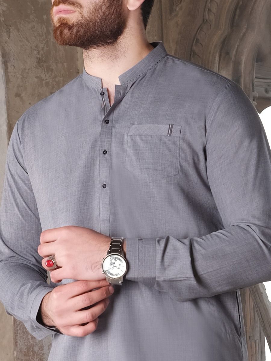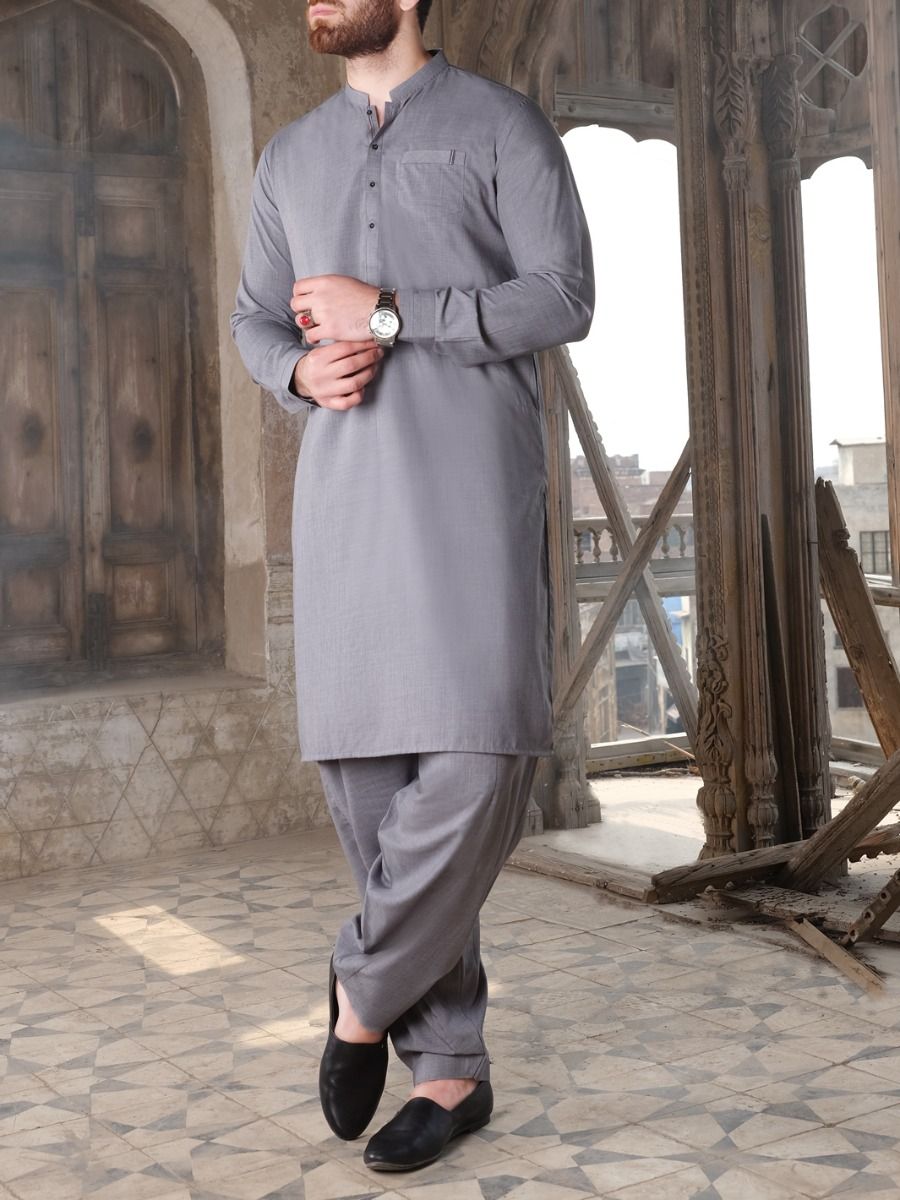 Cuts And Sew Kameez Shalwar Stitched In Blended Fabric With Details On Collar, Placket And Cuffs.