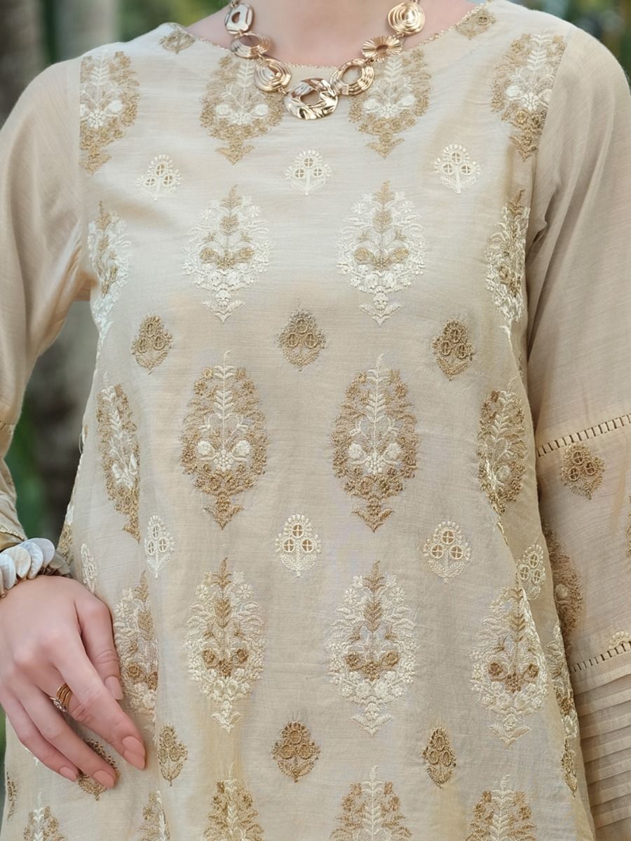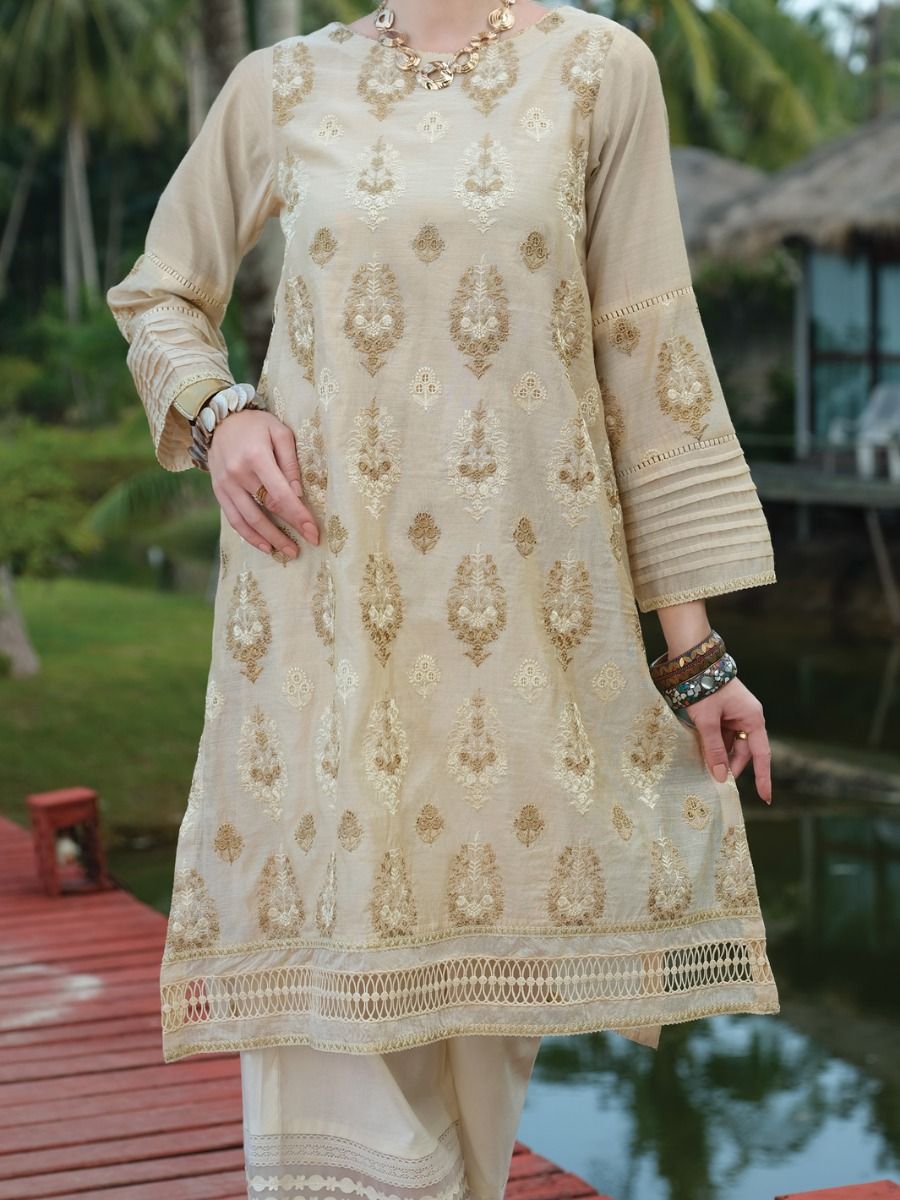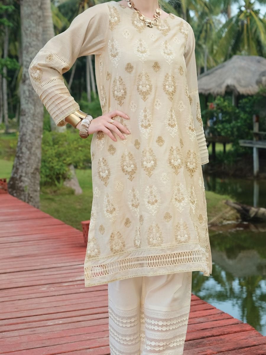 Long Length Beige Gold Schiffli Embroidered Khaddi Shirt With Lace Details On Hemline And Sleeves