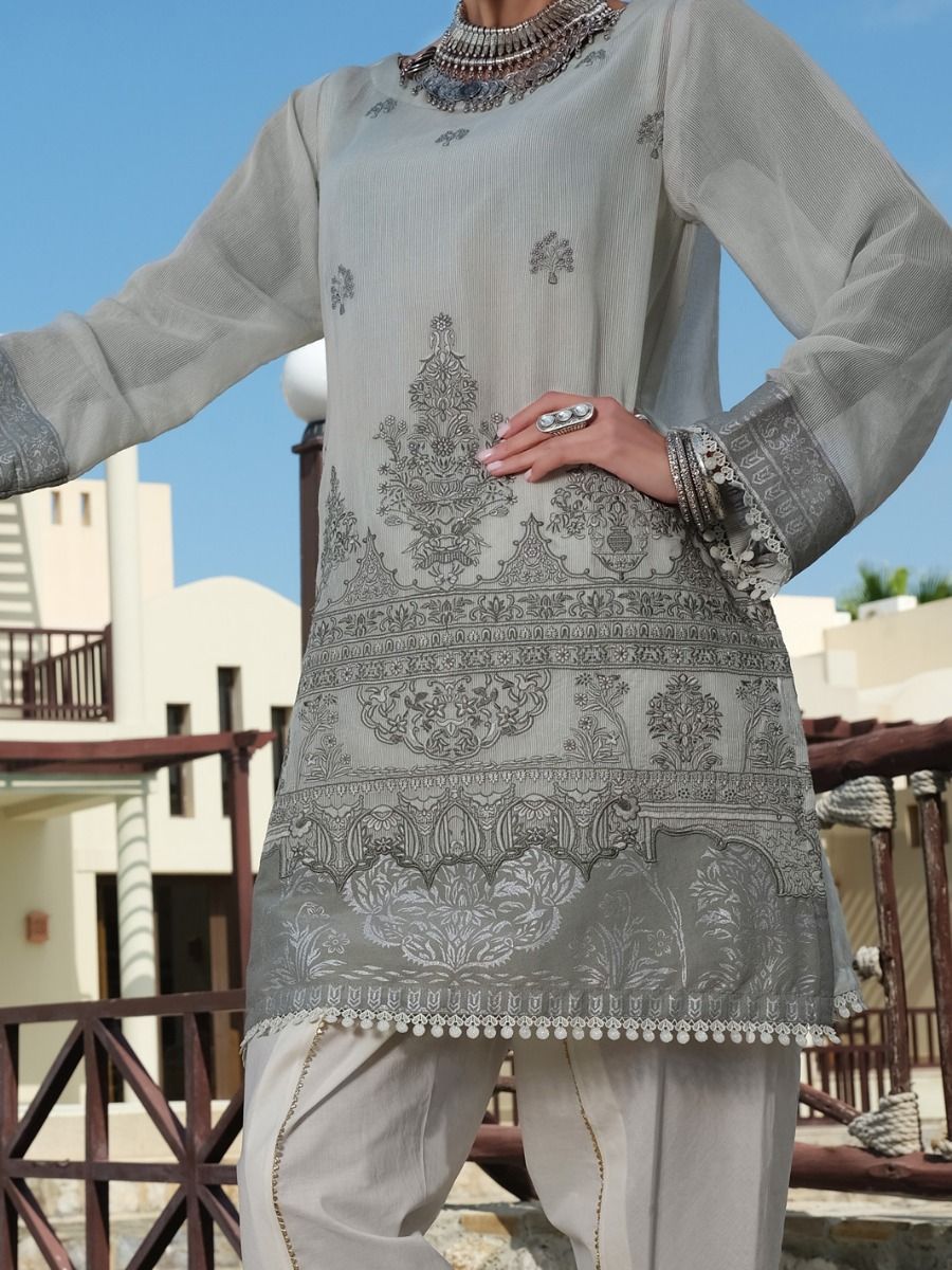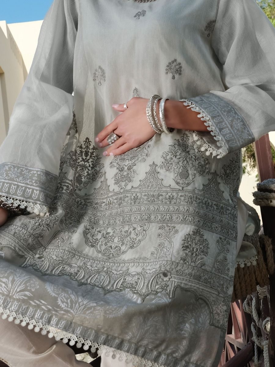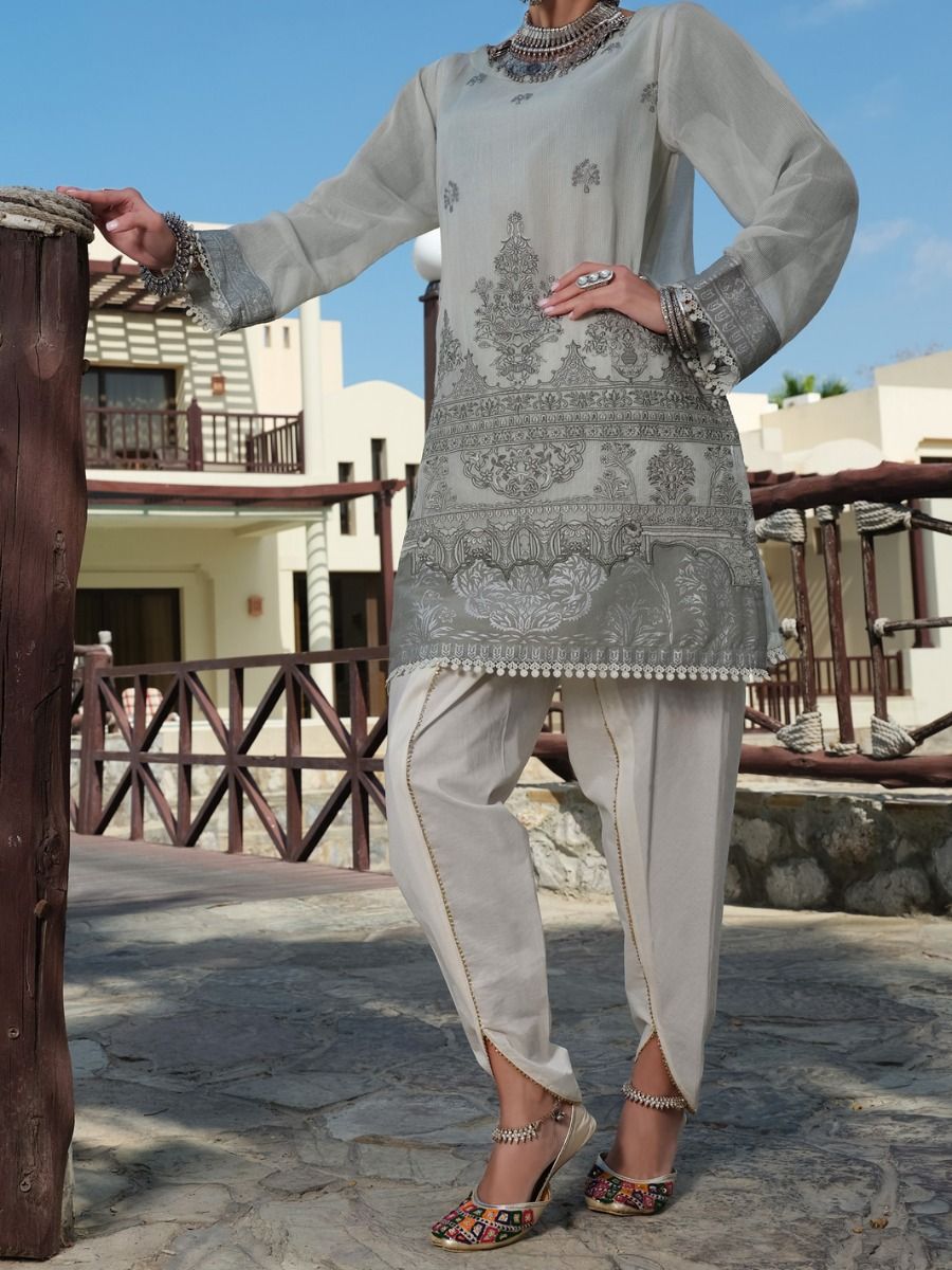 Monotone Embroided Front With Cutwork And Silver Screen Printed Organza, Stylized With Laces.