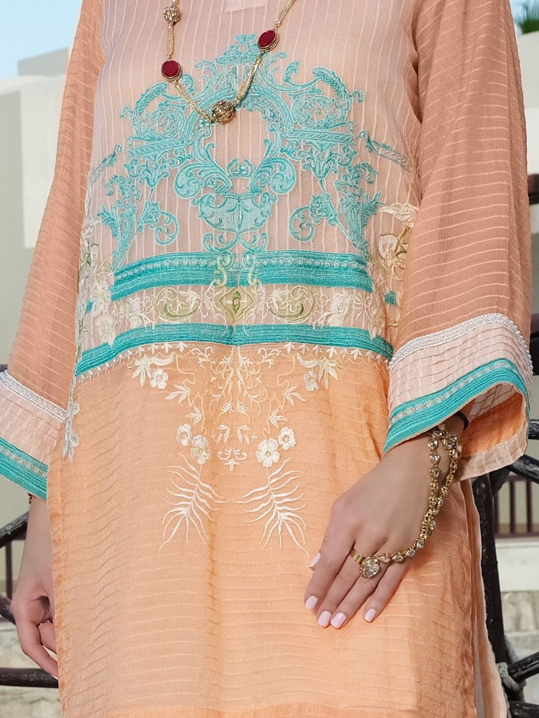 Line Work Khaddi Net Shirt With Contrasting Embroidery On Waist Line And Placket Neckline