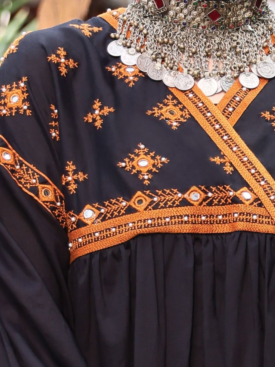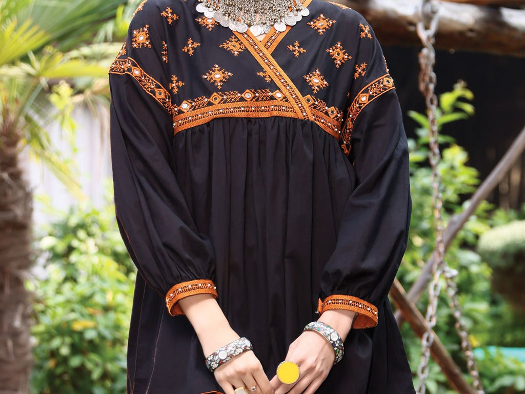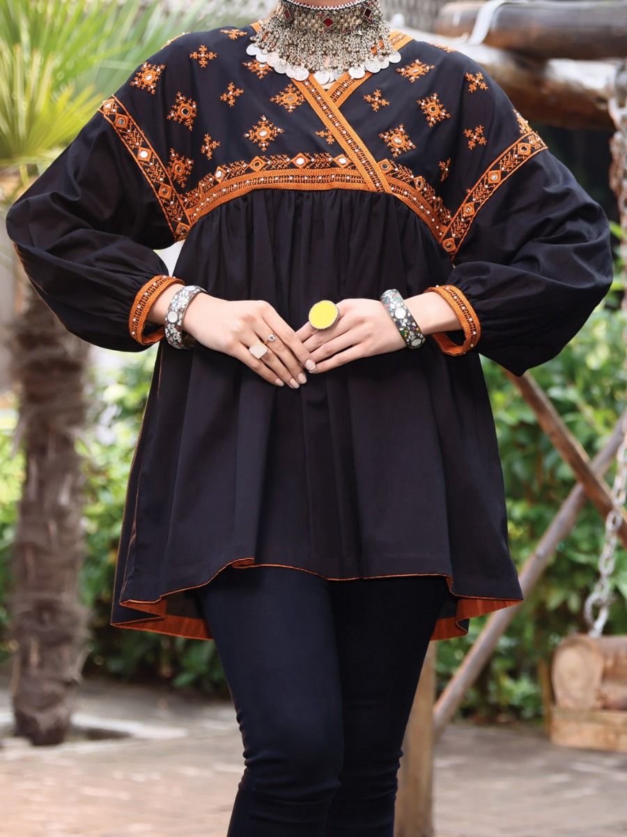 Frock Style Shirt With Drop Shoulders And Gathered Sleeves, Adorn With Embroidery On Bodice.