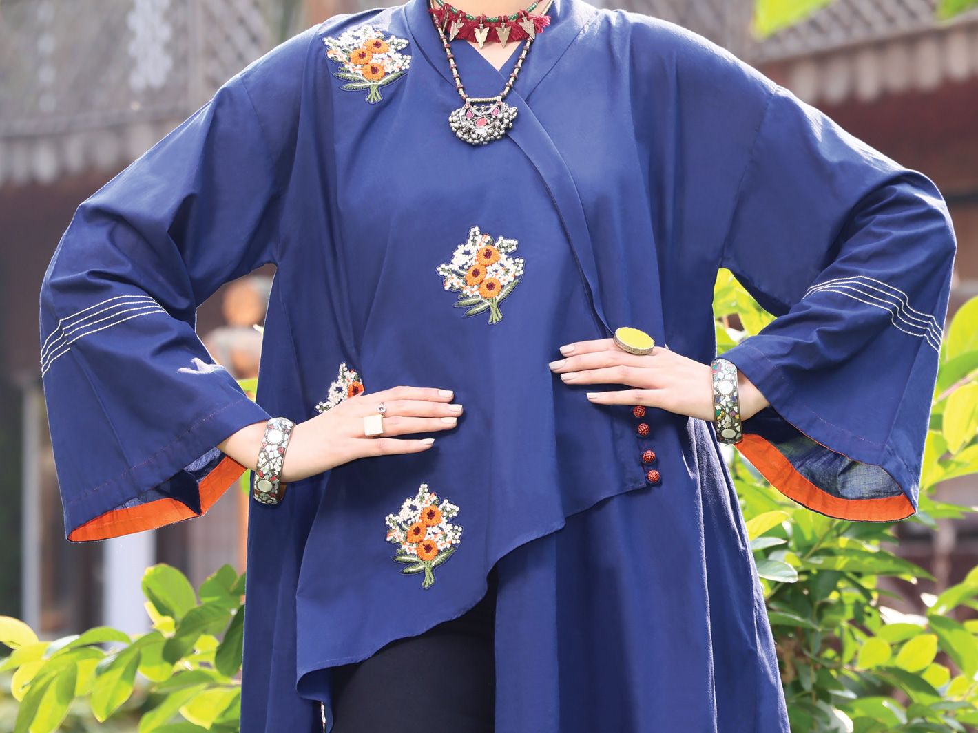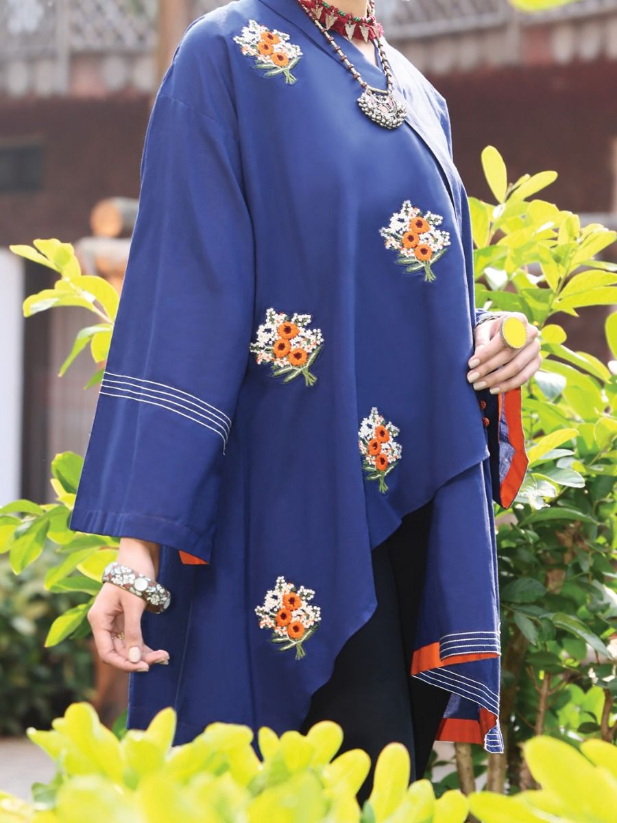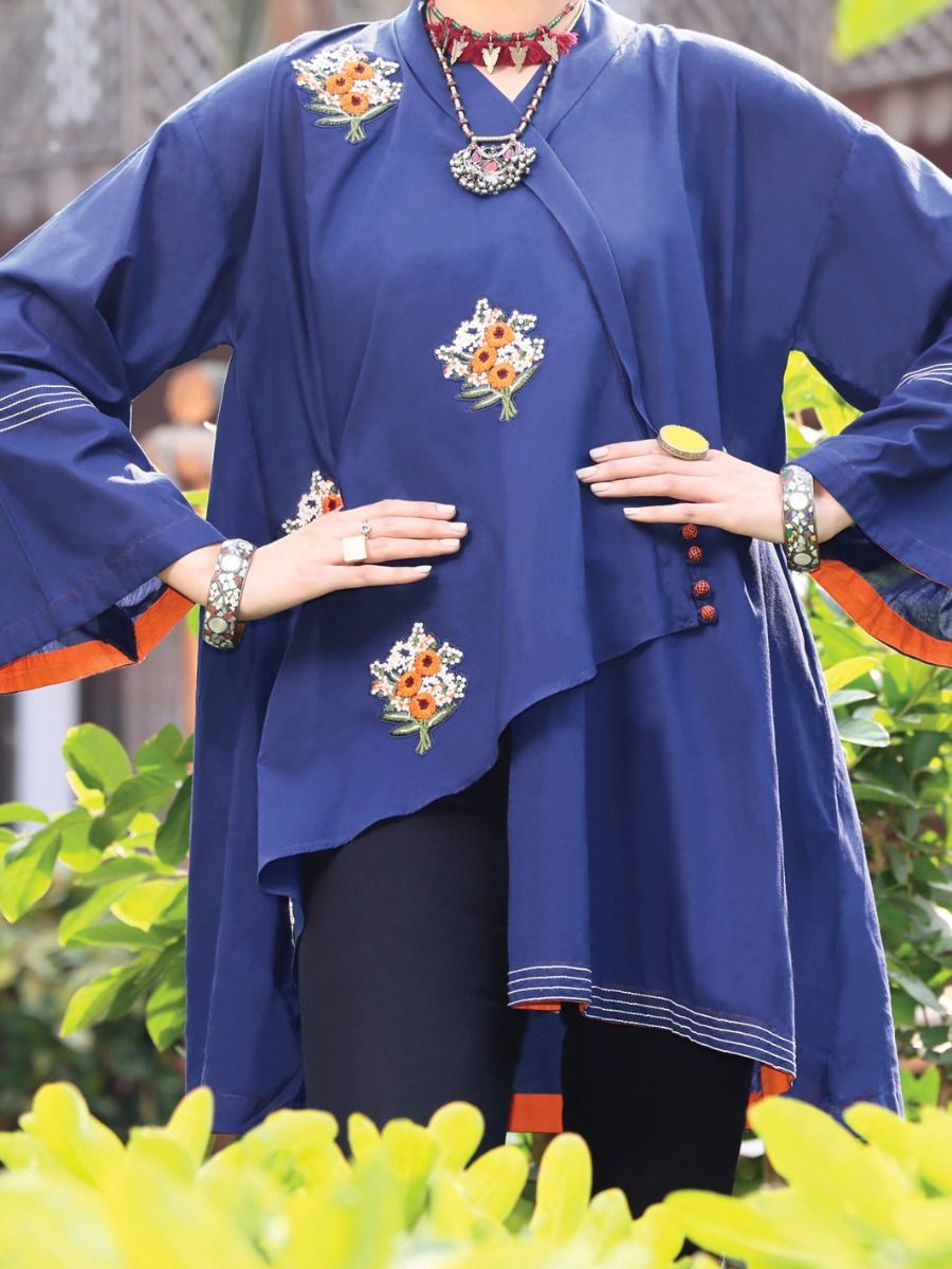 Asymmetrical Overlapped Top Enhanced With Embroidery Bunches On Front.