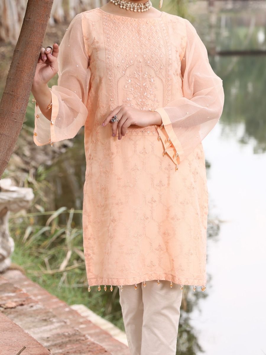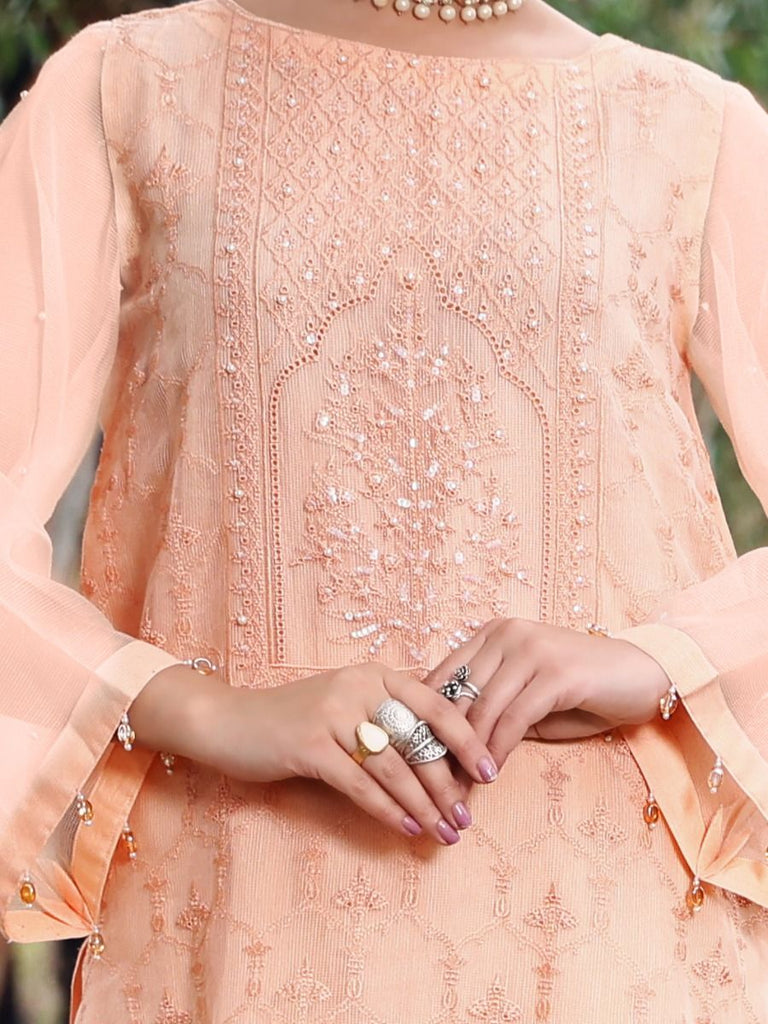 Khaddi Square Net Shirt With Embroidered Front & Sleeves. Beautify With Dangles On Sleeves And Daman