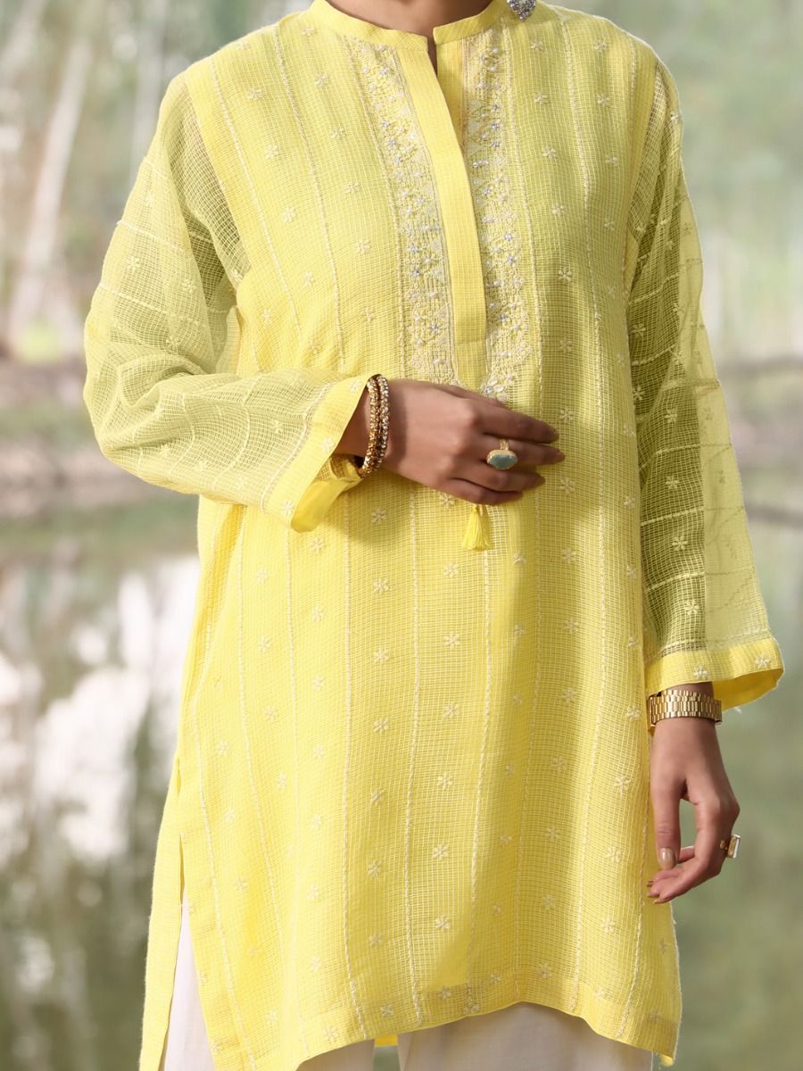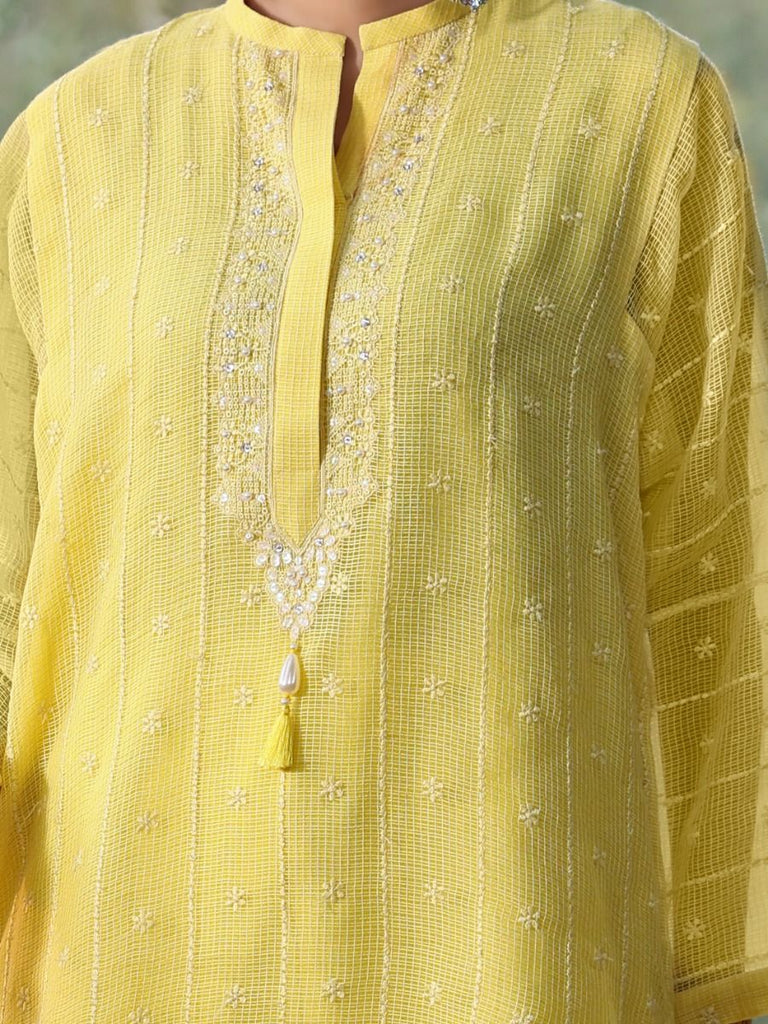 Khaddi Square Net Shirt With Embroidered Front & Sleeves. Beautify With Tassel And Hand Touch-Up On Band Collar Neckline