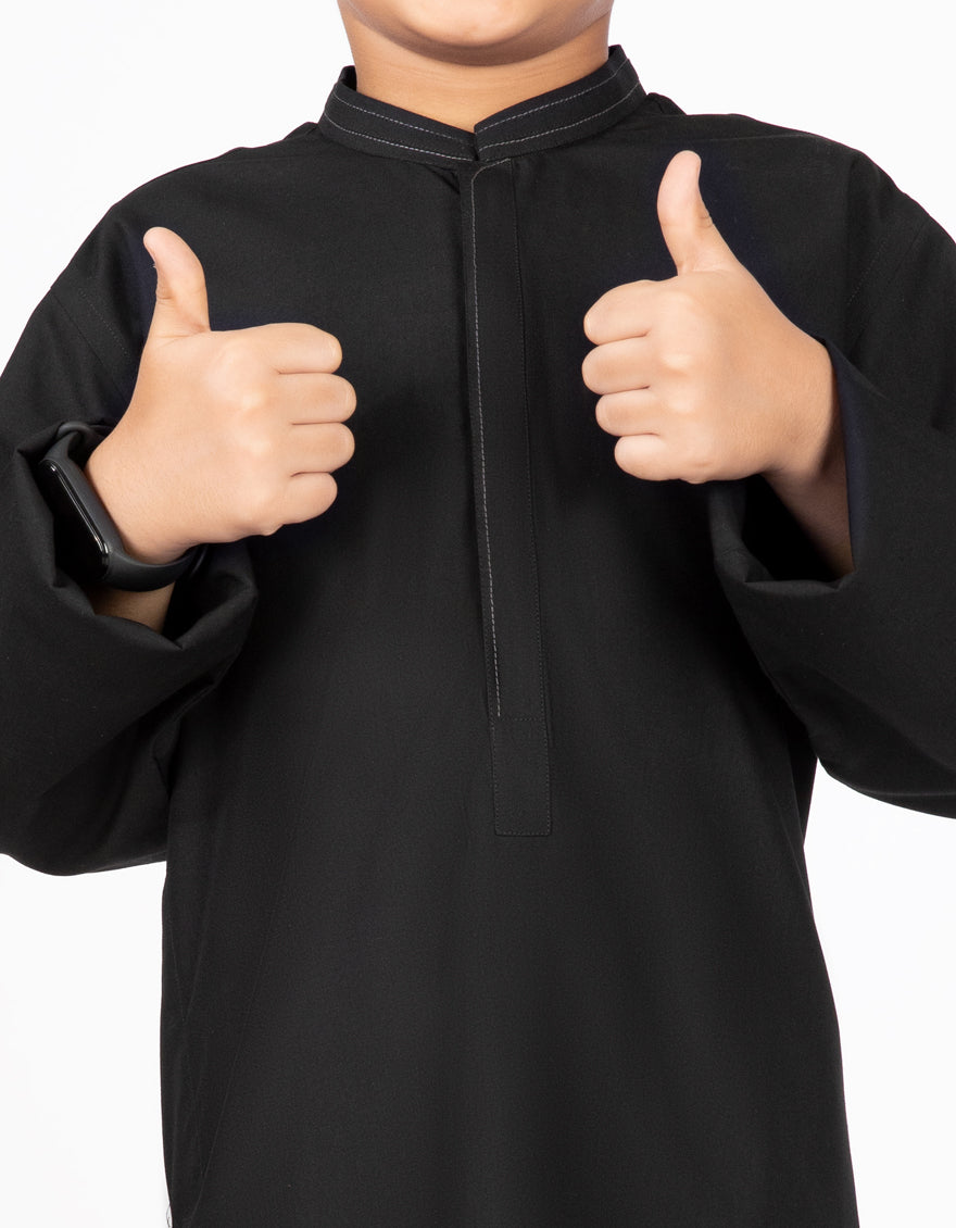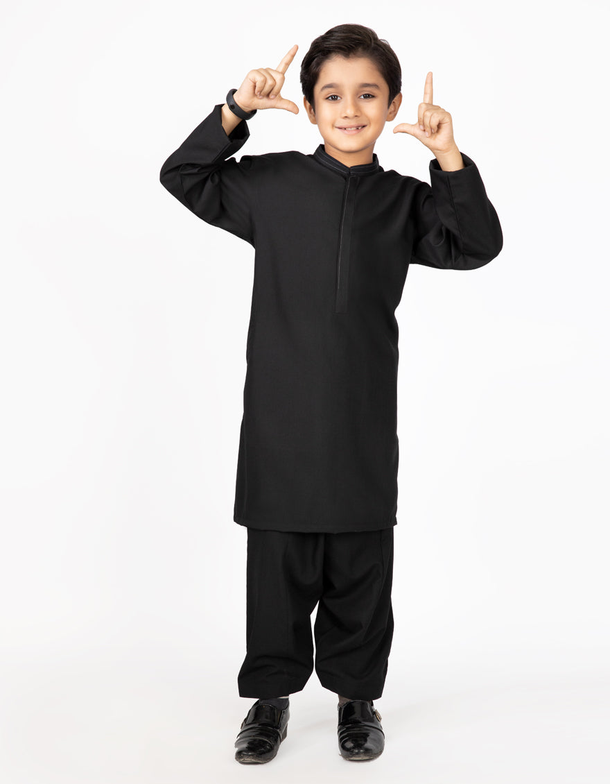Kids Shalwar Kameez In Black Color Detailed With Stitches.