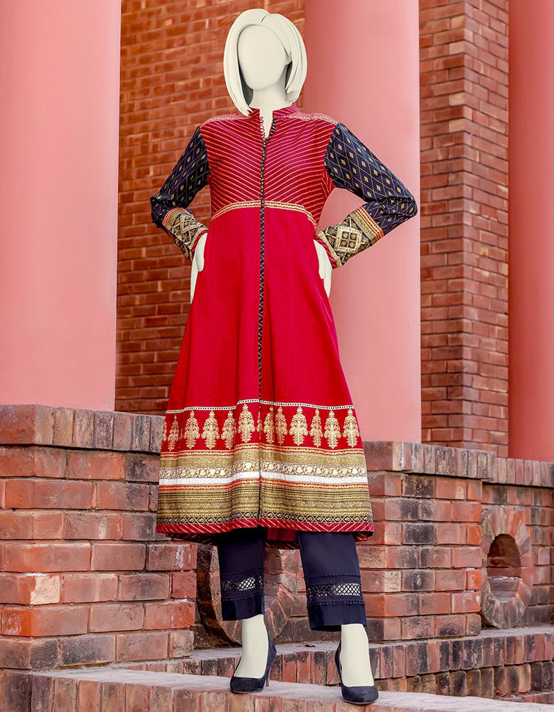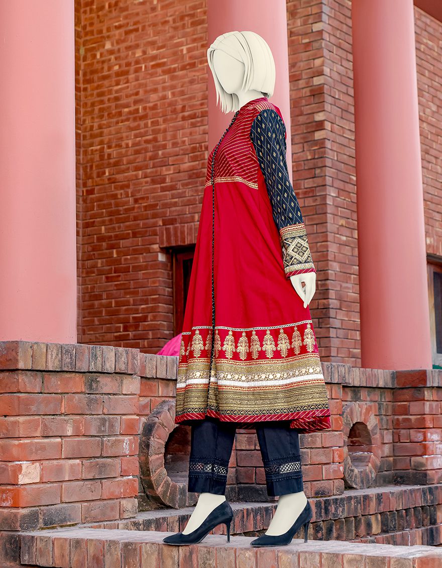 Description: Extensive Block Printed Anarkali, Band Collar Finished With Loop Buttons. Color Blocking Block Printed Sleeves.