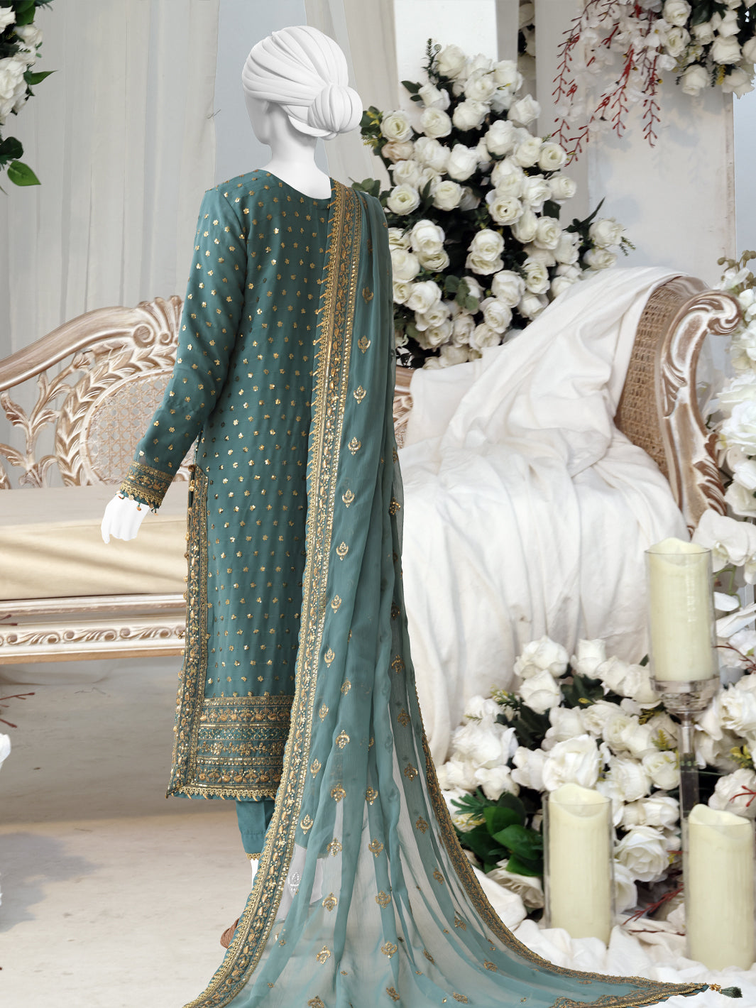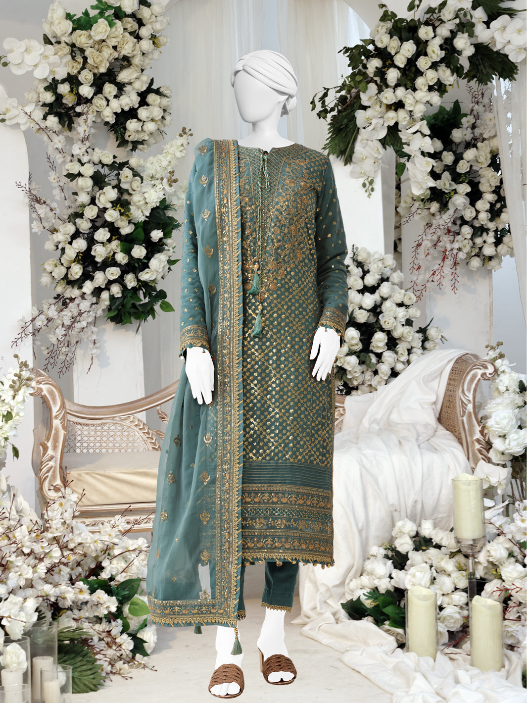This elegant ensemble is truly remarkable, featuring an teal 3 piece stright shirt with heavily embellished Chiffon dupatta. The celestial intricate machine embroidery with Gold sequence and details on this outfit are truly stupendous, making it the perfect choice for you.