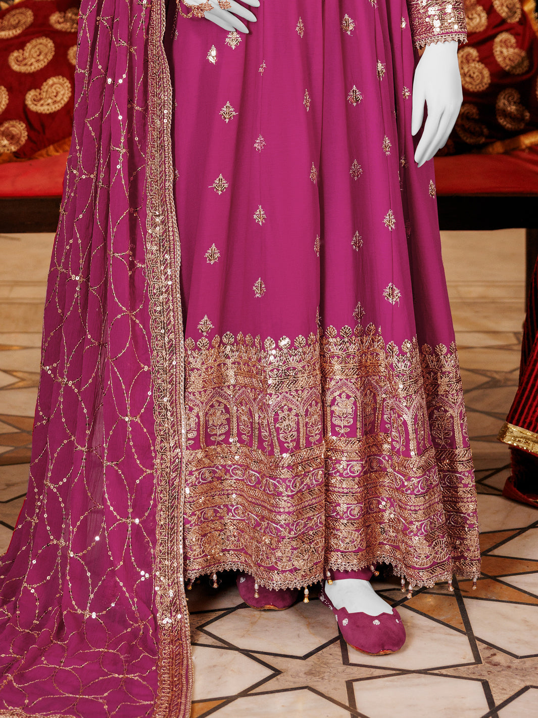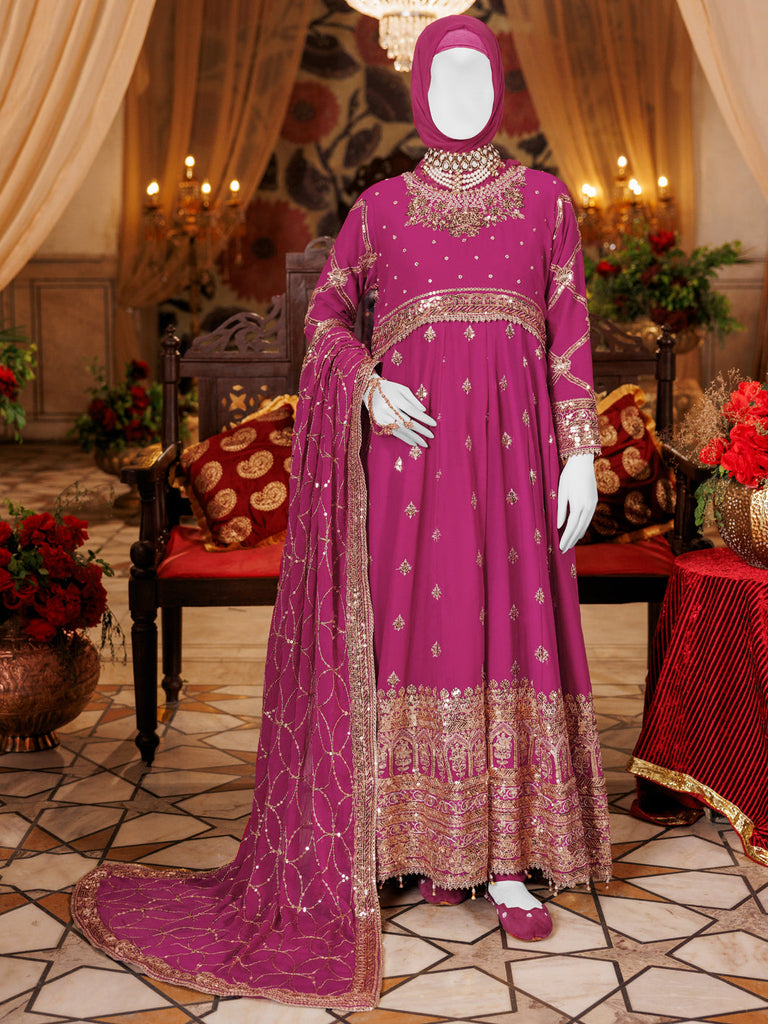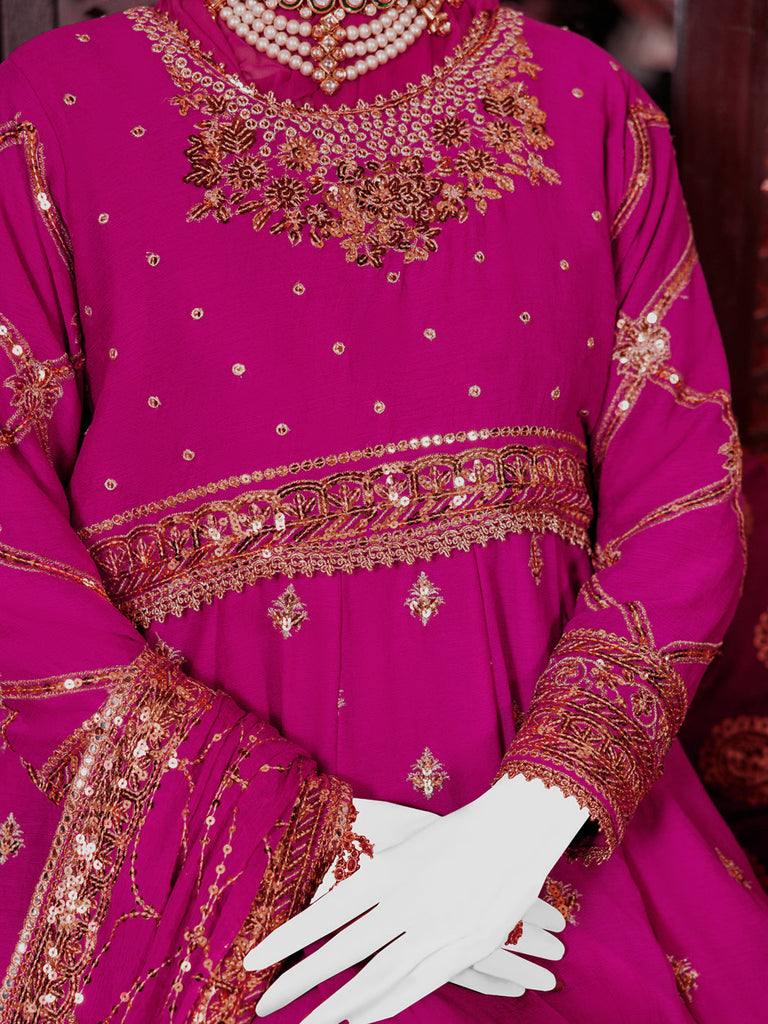 The chiffon frock Edit, Where timeless elegance blends with contemporary chic. Vibrant and vivacious, this magenta chiffon frock is a masterpiece of embroidery, featuring intricate patterns that dance across the fabric, and a flowing design that's perfect for making a statement.