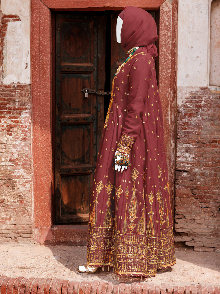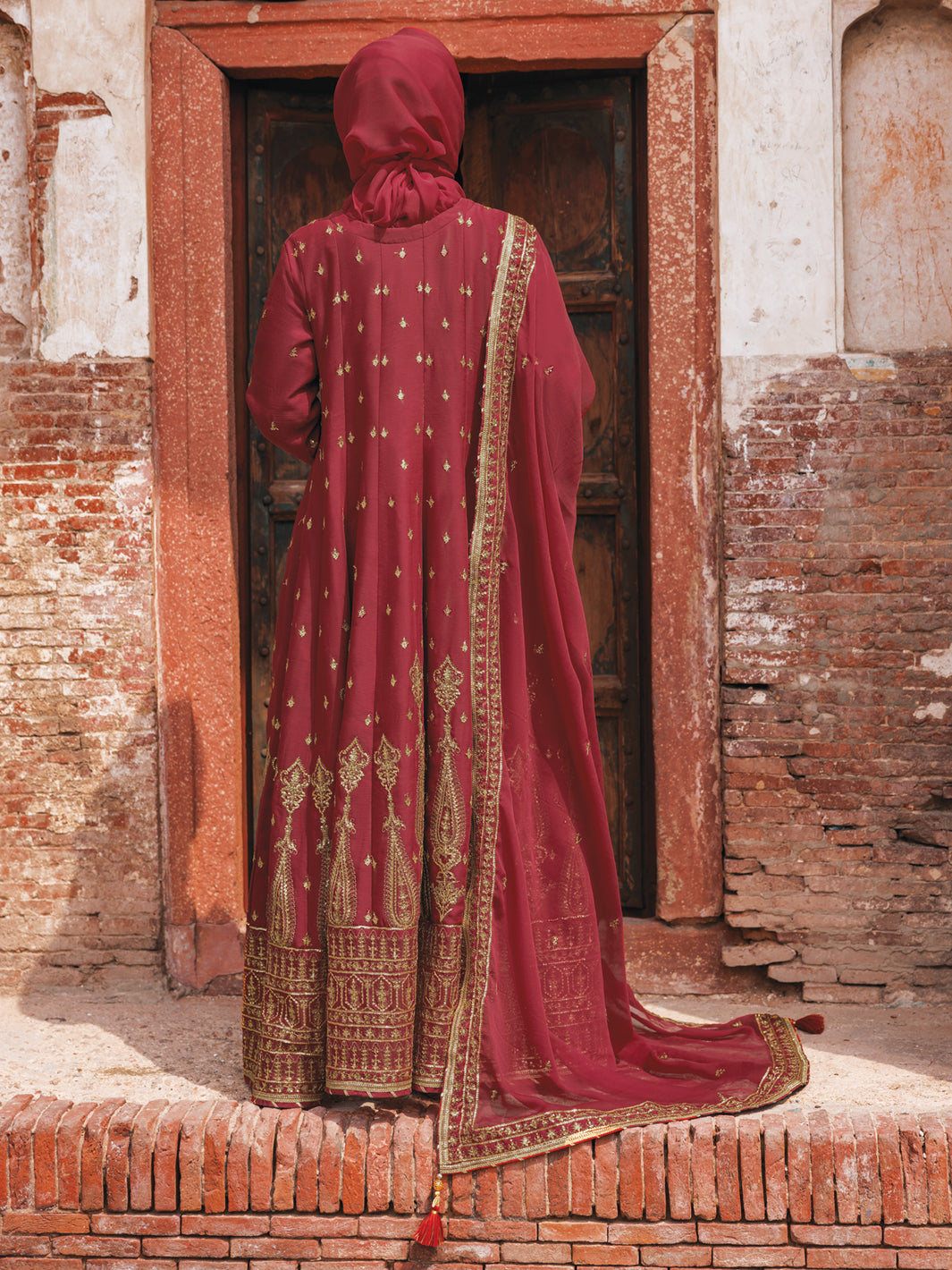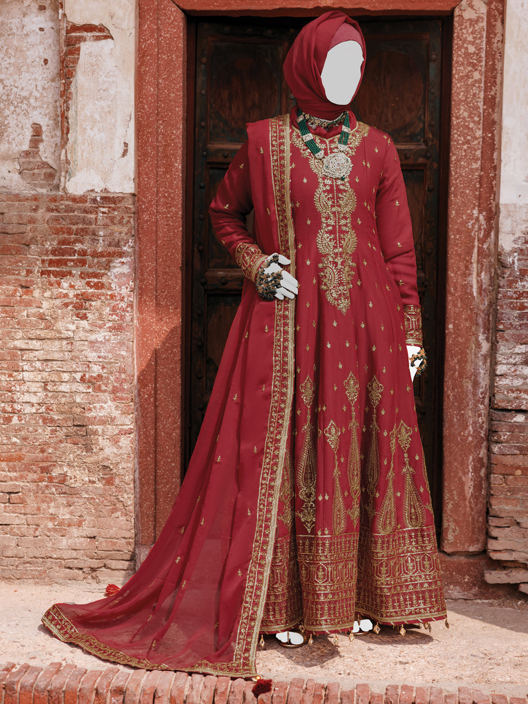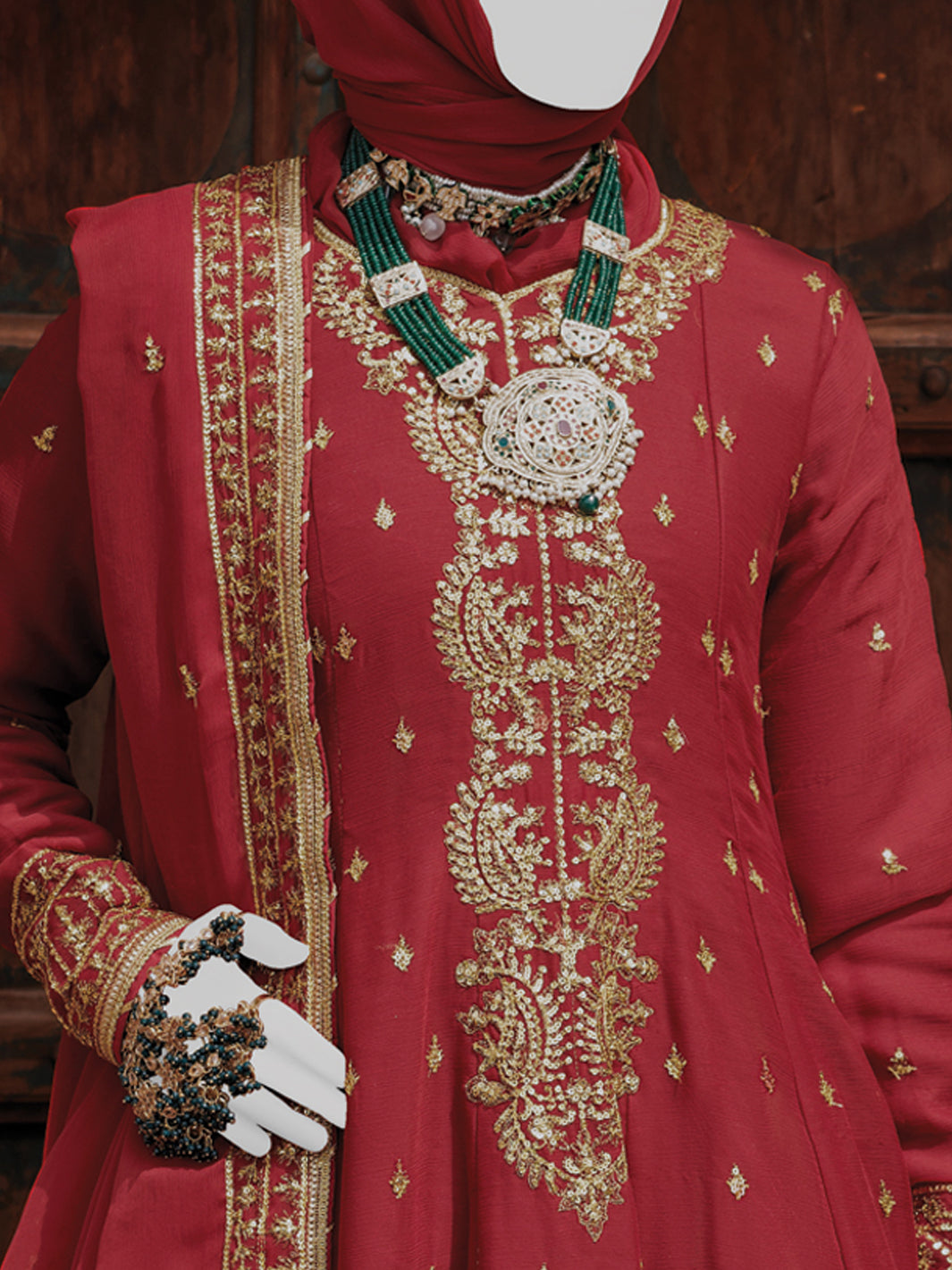 Tradition with a hint of chic, The red pishwas paired with beautiful combination of Gold is adorned with motifs, The look is finished with a sheer dupatta. The elegant resham thread-work and sequins compliments the look..