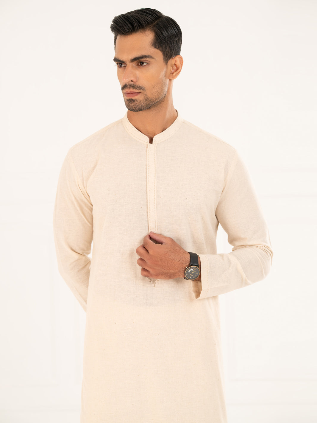 Cream Kurta Trouser With Minimal Stitch Detail On The Placket And Collar